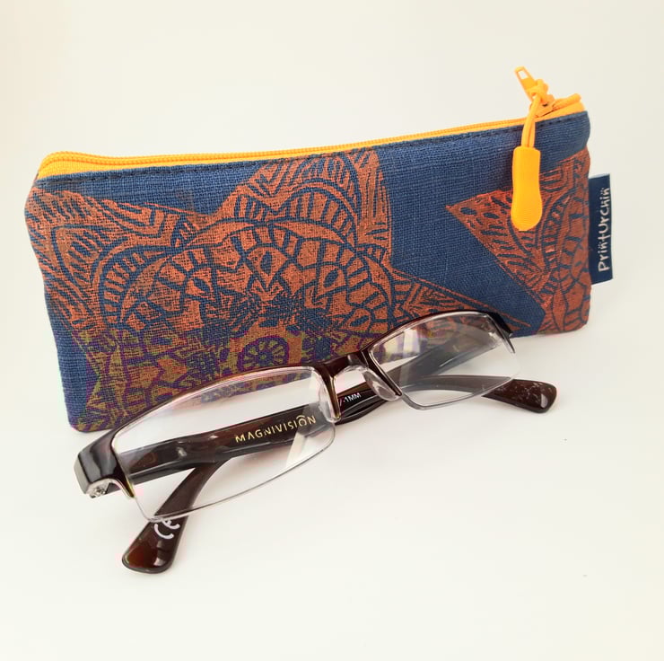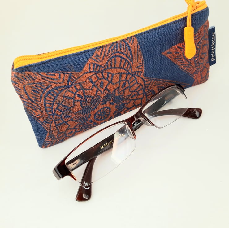 Slimline, zipped spectacle case, handprinted with original lino print on Cornish Linen