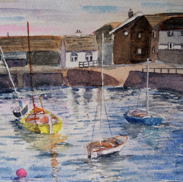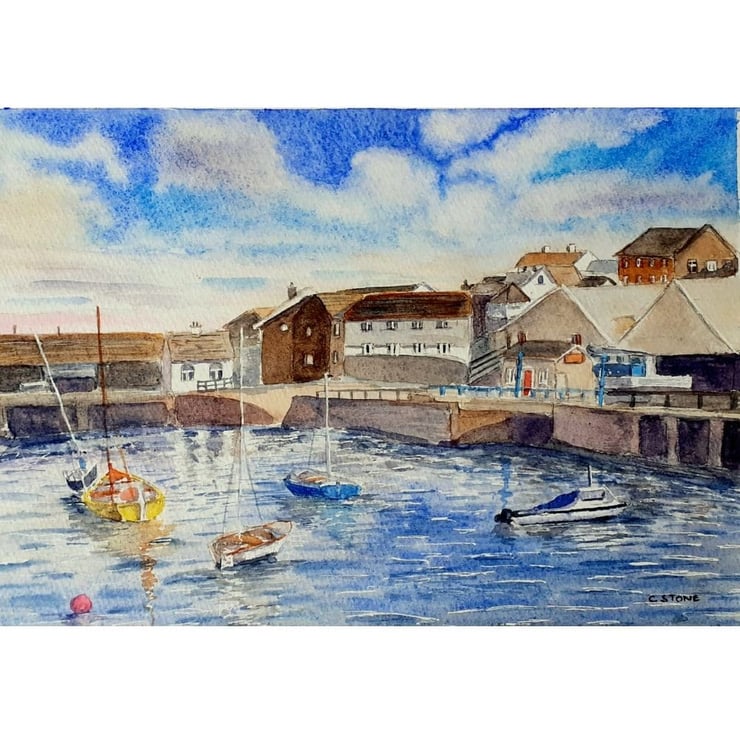 Original watercolour painting of the semi -industrial yet still beautiful Penzance harbour in Cornwall. There are small pleasure craft moored in the harbour,with light reflecting on the water.