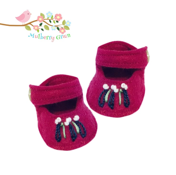 A cute little pair of fuchsia pink shoes, embroidered on the toes in navy, pistachio and white to fit the Mulberry Green characters. The shoes are hand stitched using double layers of felt and fasten with a popper underneath a little pistachio button.