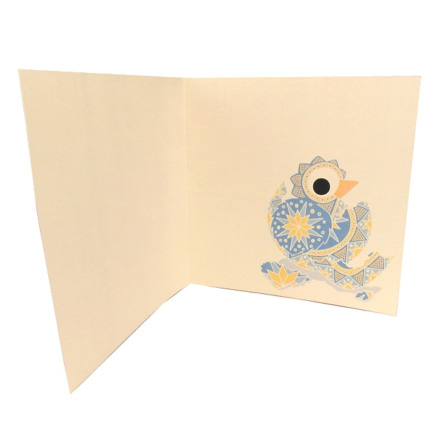The front of this card features a colourful pysanka - a decorated egg that is traditionally made in Ukraine. The colourful egg has patterns in yellow and blues. Inside the card is an image of a cute chick hatching out of the egg, its feathers sharing the same patterns that are on the cracked shell.