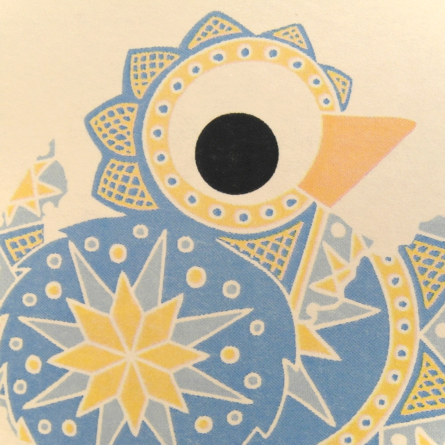 This card is inspired by seeing the decorated eggs (pysanky) that are traditional to Ukraine, and imagining what it would be like if the eggs were naturally like this, and the birds that came out of them were just as beautifully patterned and colourful as the eggs themselves.