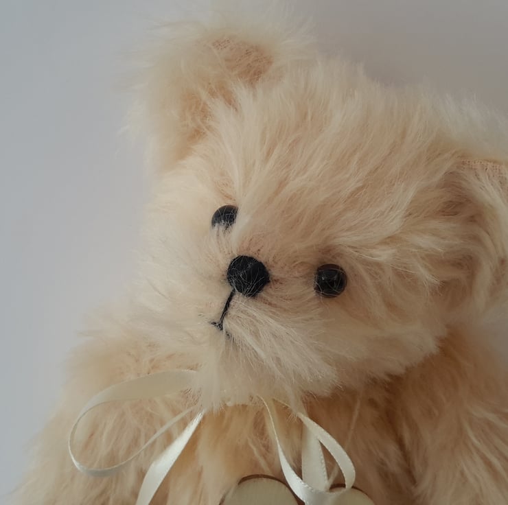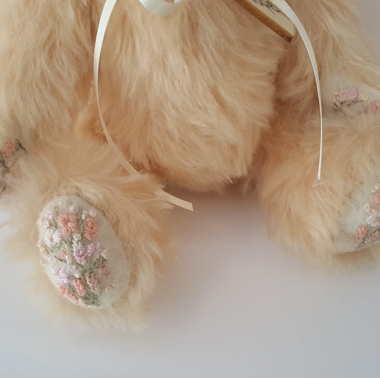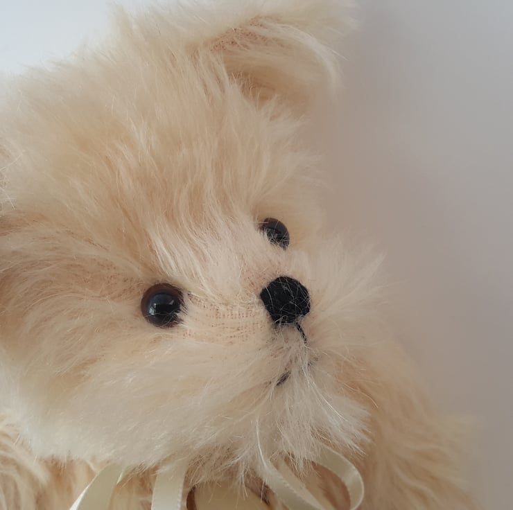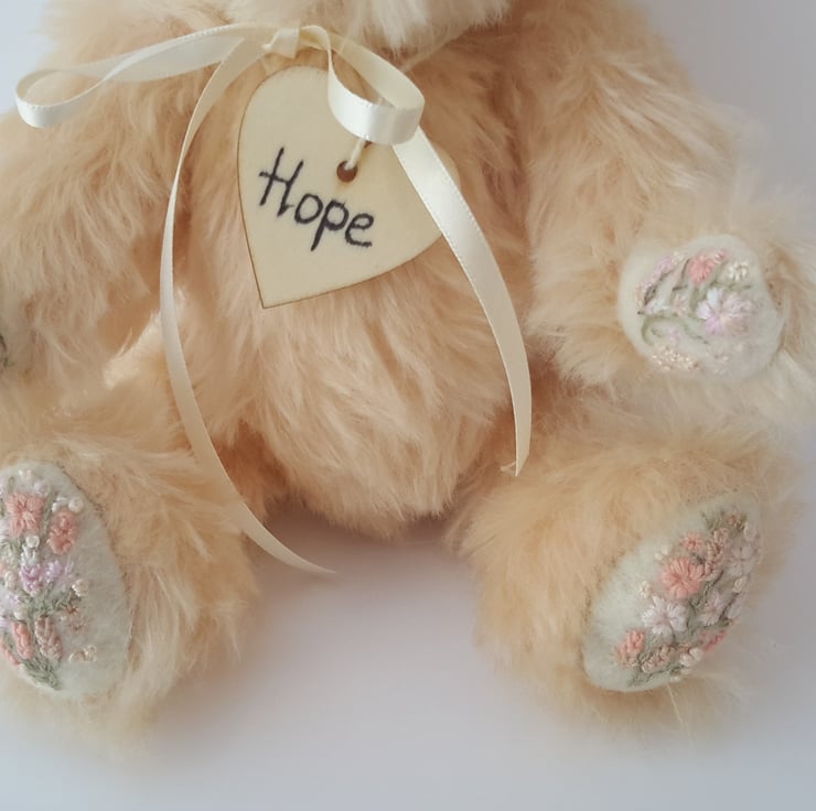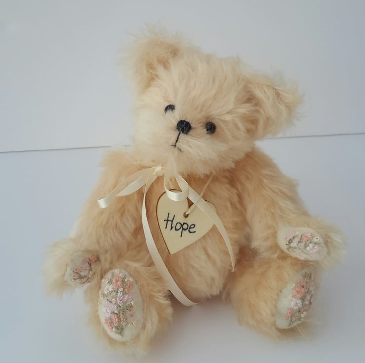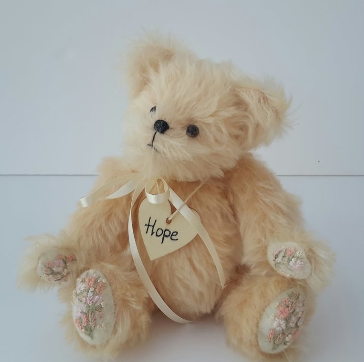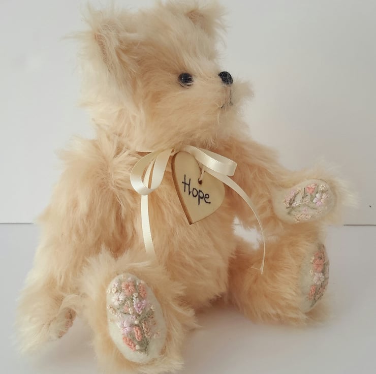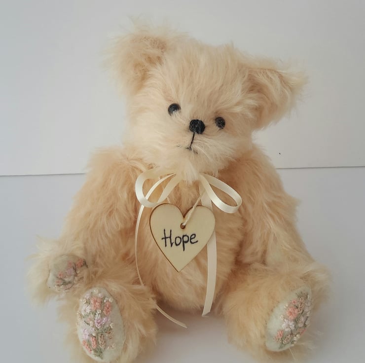 Hope, a 9" tall luxury mohair bear. Artist bear with hand embroidery designed and created by Bearlescent.