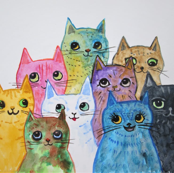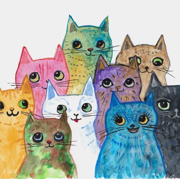 A whole bunch of colourful cats sitting together. Each cat is different with their own personality