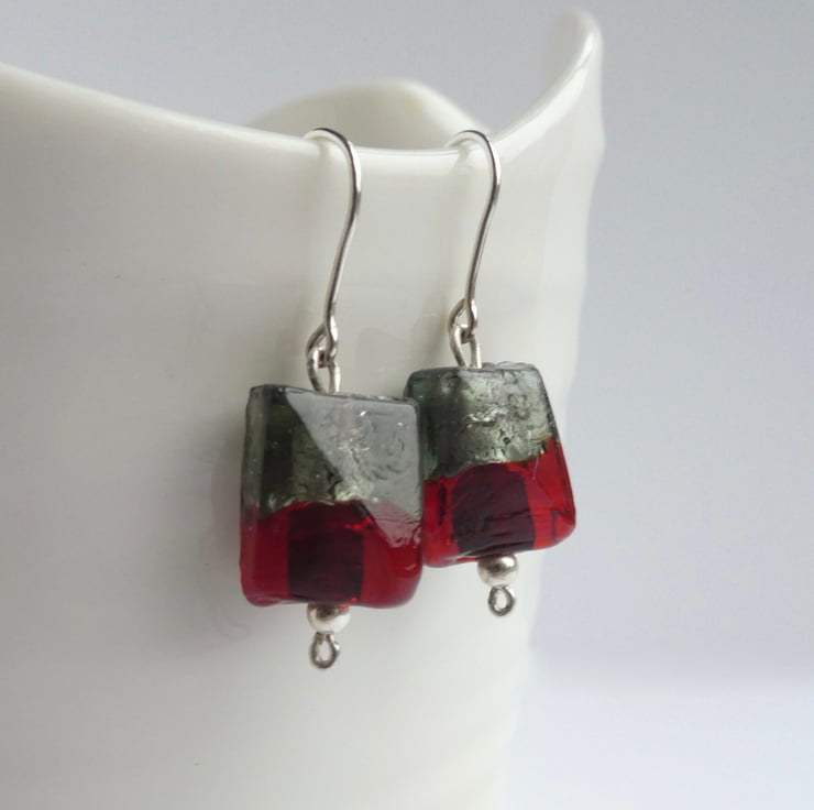 Foil-lined Grey and Red Glass Bead Earrings