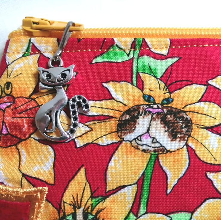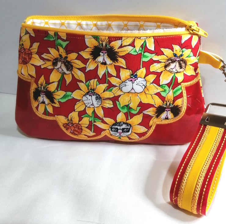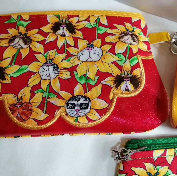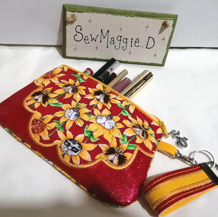 This is a ovely red bag made in Robert Kaufman CATBERRY fabric and glitter vinyl. This cosmetic/clutch bag is fully lined and has a zip closure and comes with a matching keyring. A perfect gift for a cat lover. Or, why not treat yourself. If you need any more information please don't hesitate to contact me.