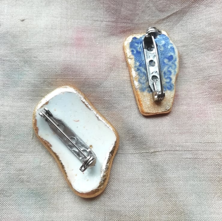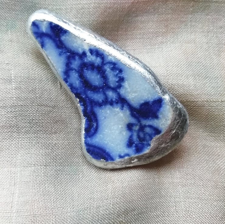 This little piece of sea smoothed pottery, found from the Kent shores is gilded at the edges with silver leaf and sealed with shellac. The brooch pin is securely attached with resin. Measures 3cm by 2.5cm.