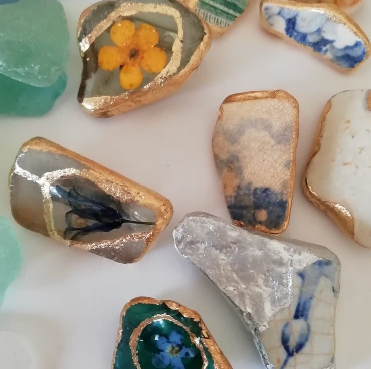 I love collecting little treasures from the Kent shores, old beach pottery, glass and shells. Much of the pottery was thrown from piers during times past and has been smoothed and shaped by the sea. I transform them into a lovely keepsakes with a bit of history.