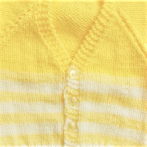 Cardigans are an essential part of every babies wardrobe. This very pretty and practical baby's cardigan is hand knitted in different shades of yellow 4 ply wool.