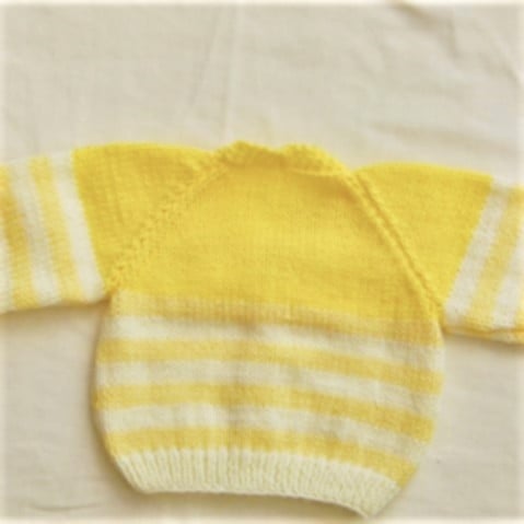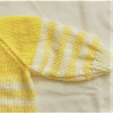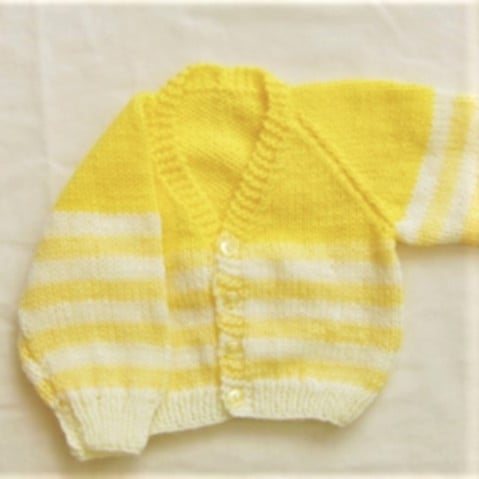 Cardigans are an essential part of every babies wardrobe. This very pretty and practical baby's cardigan is hand knitted in different shades of yellow 4 ply wool.