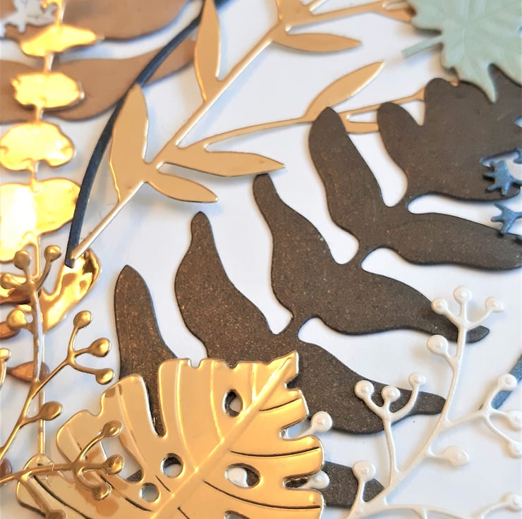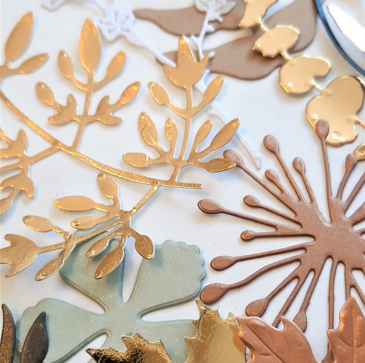 A pack of 20 die cuts, handmade from pearly, plain and mirror card. Sizes range from 1x3.5cm to 4x12cm (tall berry branch). Mainly browns and golds, with a few other neutral colours.