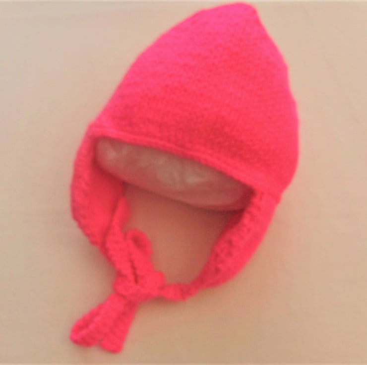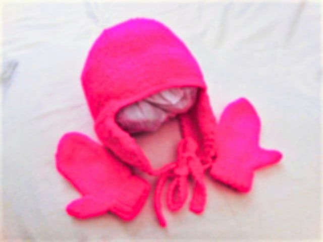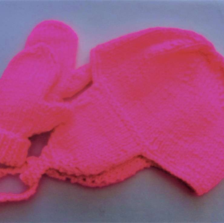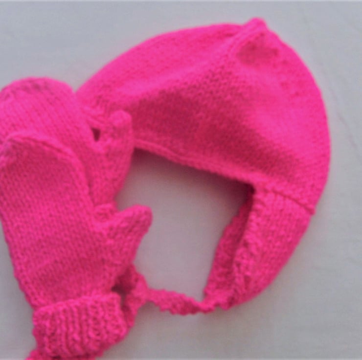 Vibrant shocking pink set including a hat with ear flaps and a pair of mittens with thumbs.The measurements are, Hat 16 inches around Head, Mittens 4.5 inches around hand. It would make an ideal gift for a birthday, a baby shower, a new baby or just as something to keep your little ones warm on a chilly day.