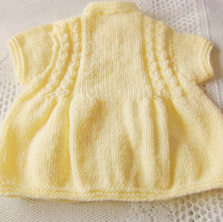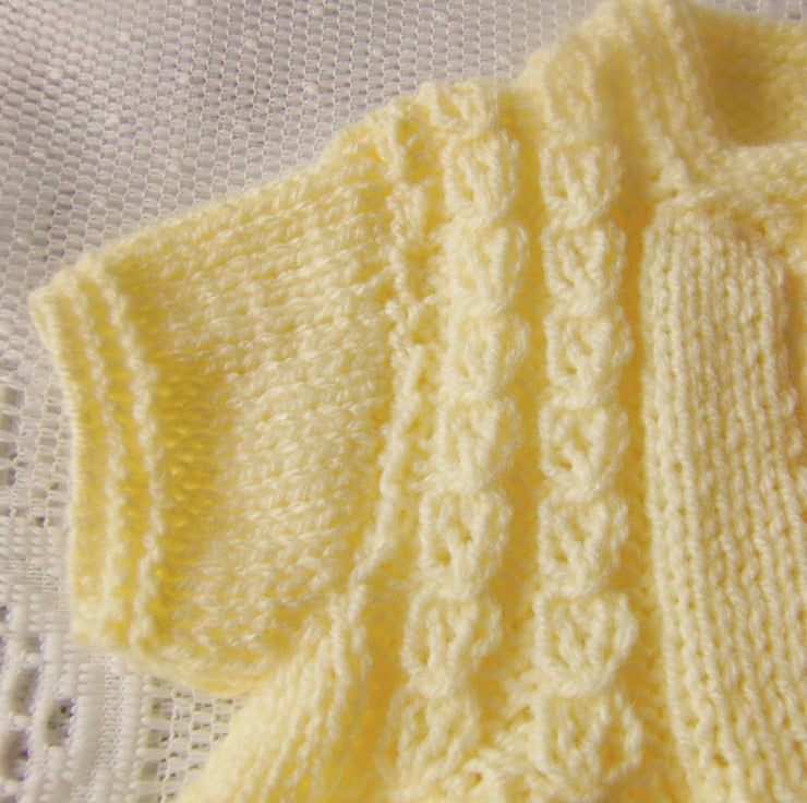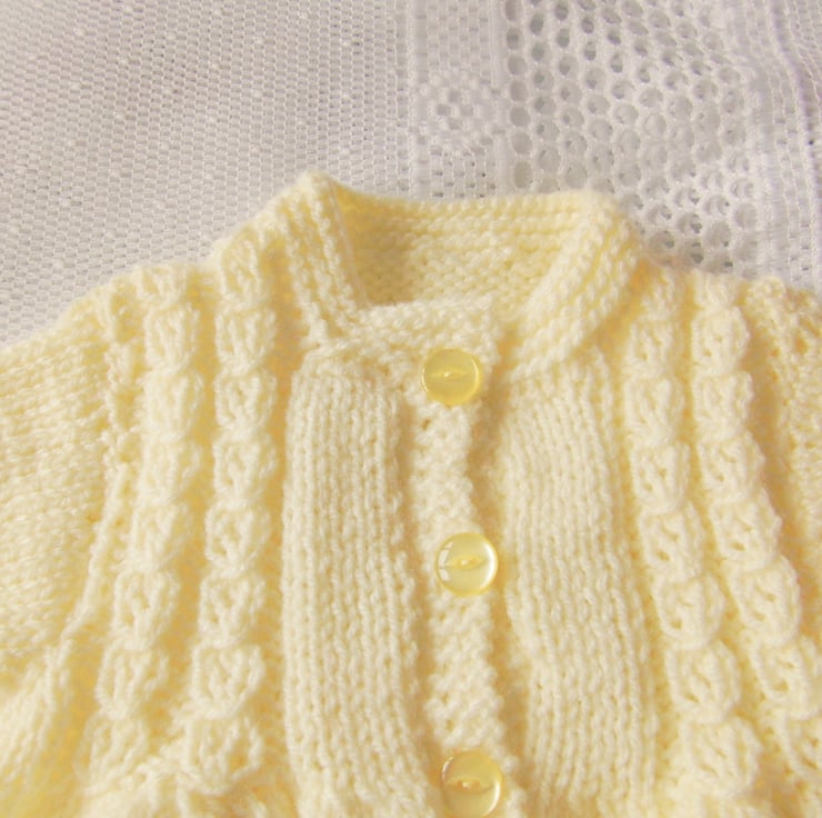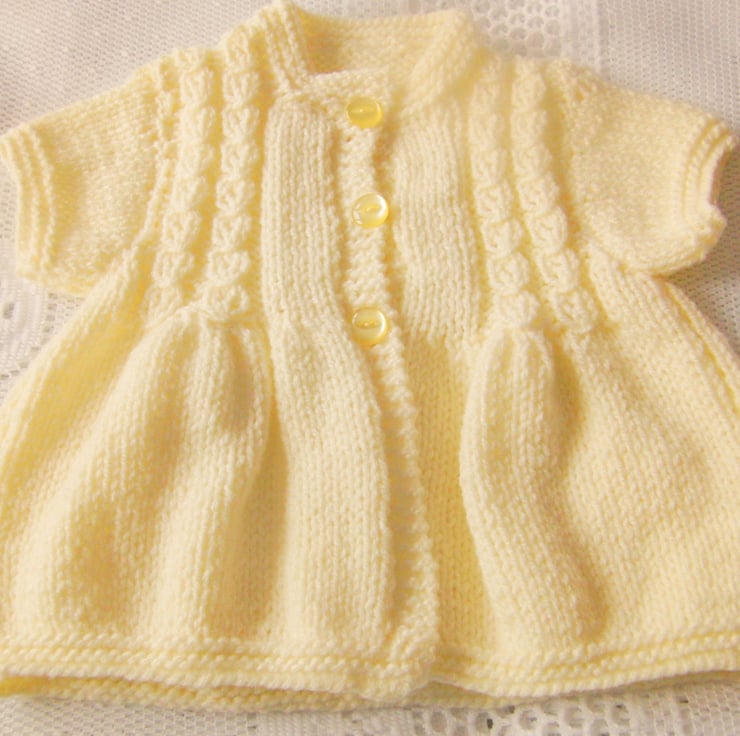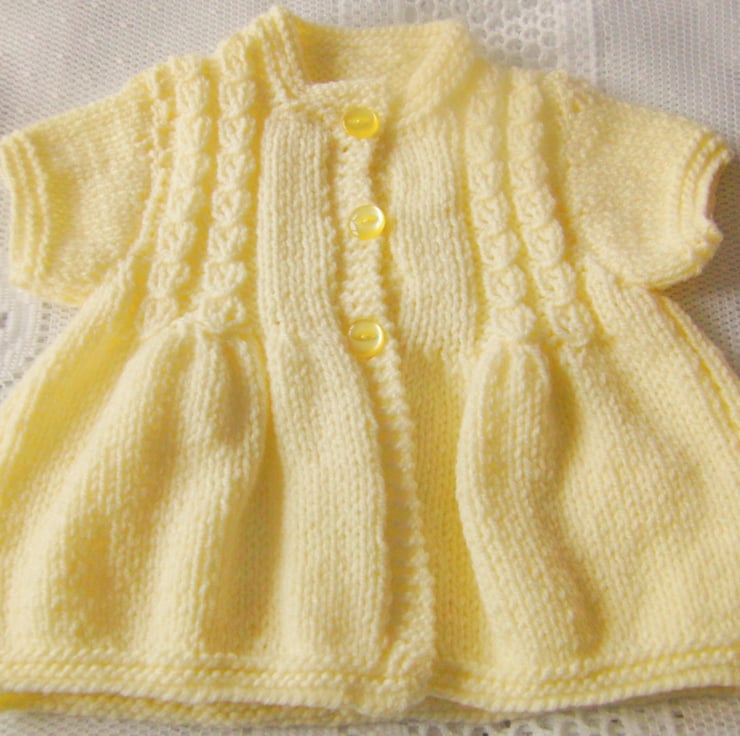The cardigan is in stock in the lemon colour shown in a size to fit a 2 - 3 year old with a 22 inch chest. It can also be made in a size and colour of your choice, please state colour choice when you order. The processing time for this cardigan will be 1 - 2 weeks to produce and post to you. It can be made with a choice of round neck or V neck and with long or short sleeves.