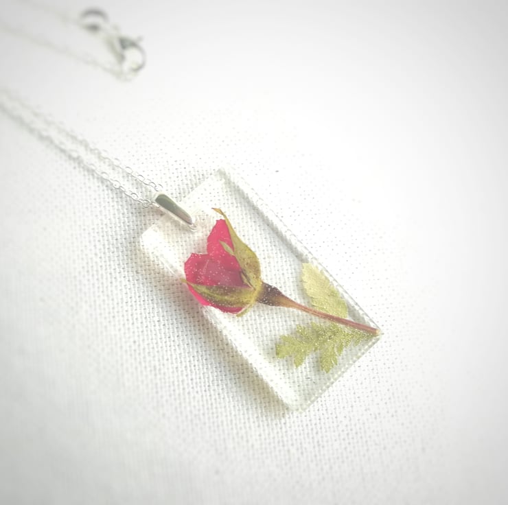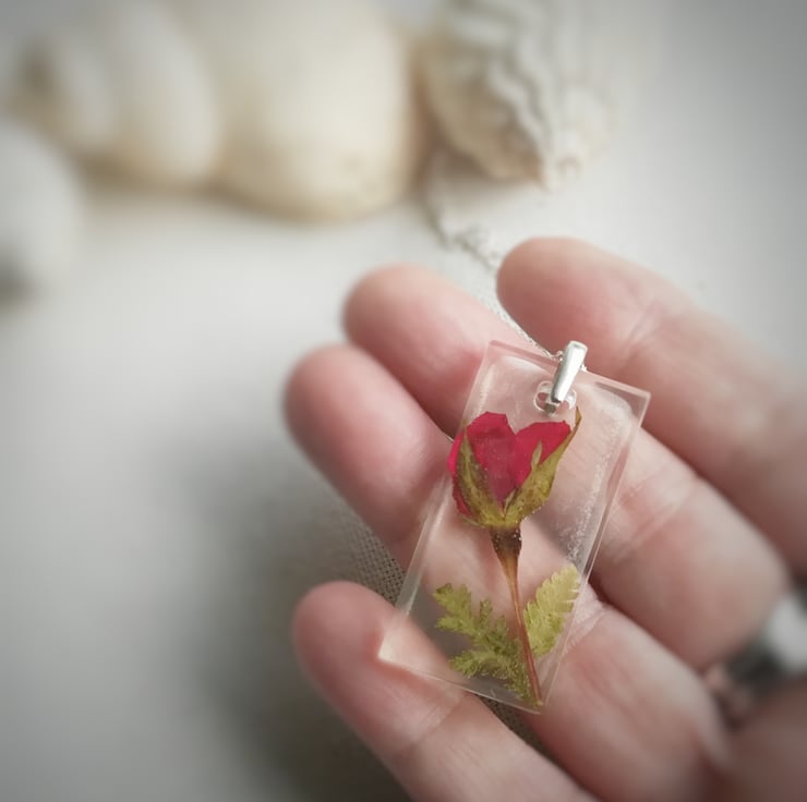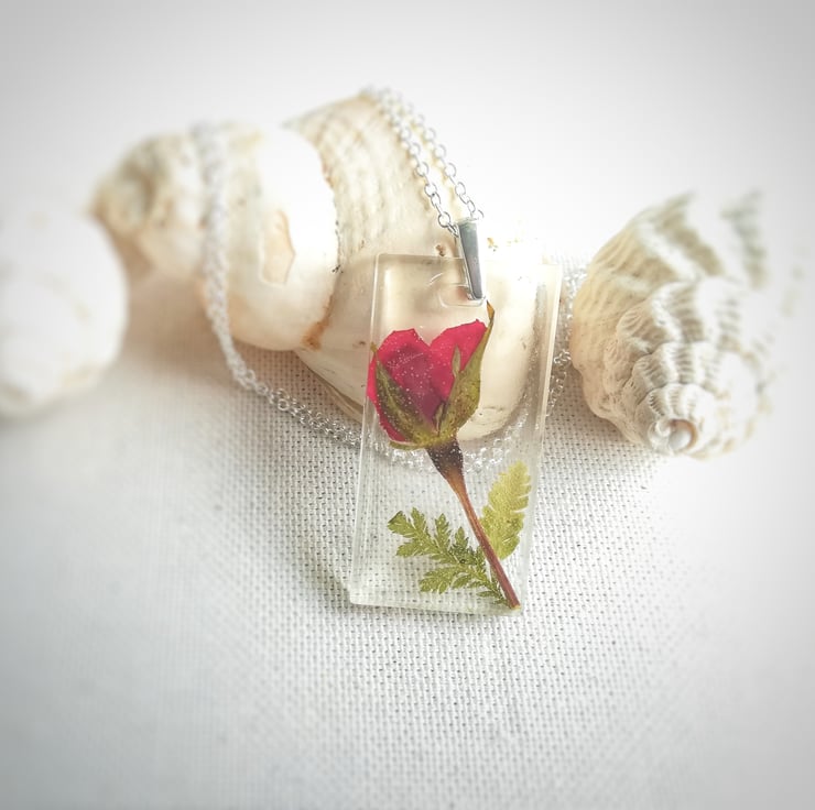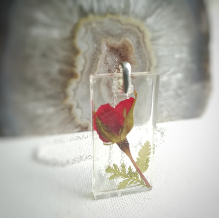 A beautiful red rose suspended in crystal clear, jewellery grade resin with little green fern leaf accents. This rectangle resin pendant is hung from a solid silver bail and a sterling silver chain. A thoughtful gift for Mum, Valentine's gift or for any loved one. Or even a lovely treat to yourself....