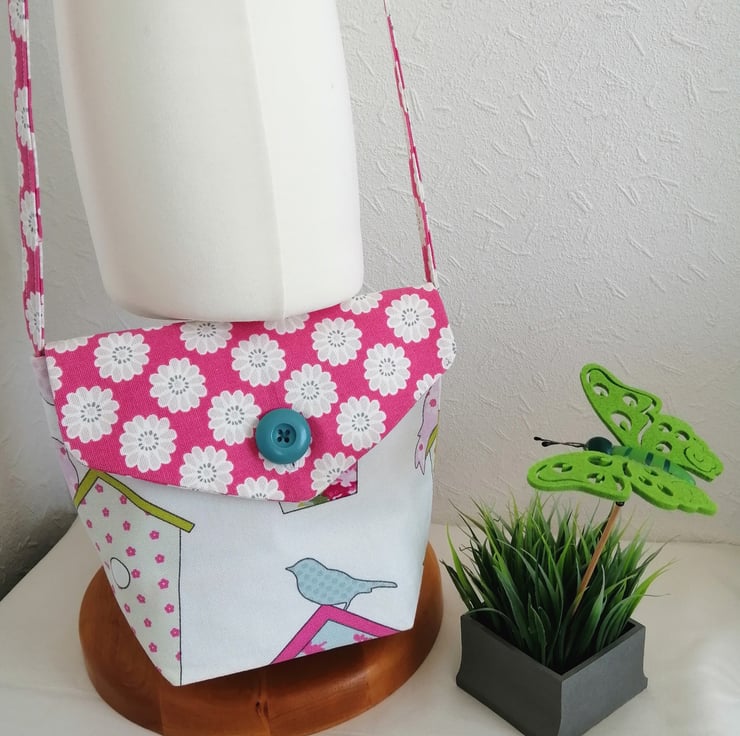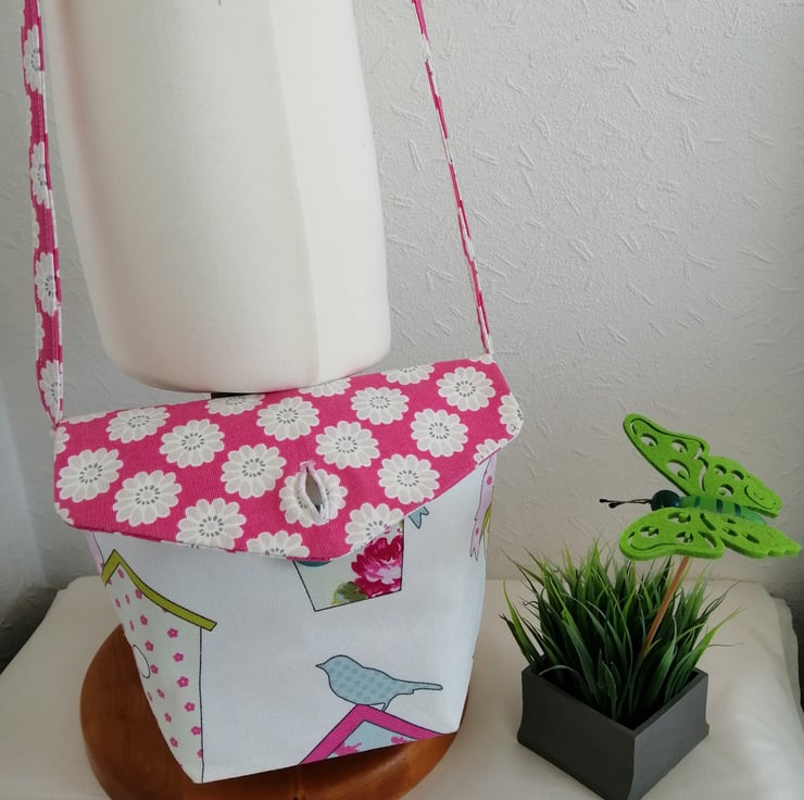 This cute shoulder bag is made in a lovely bird themed fabric and has a lovely contrasting pink fabric with white flowers for the front flap and handle.. The bag is fully lined and measures 7.5" x 9".