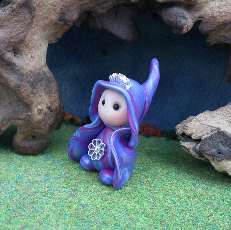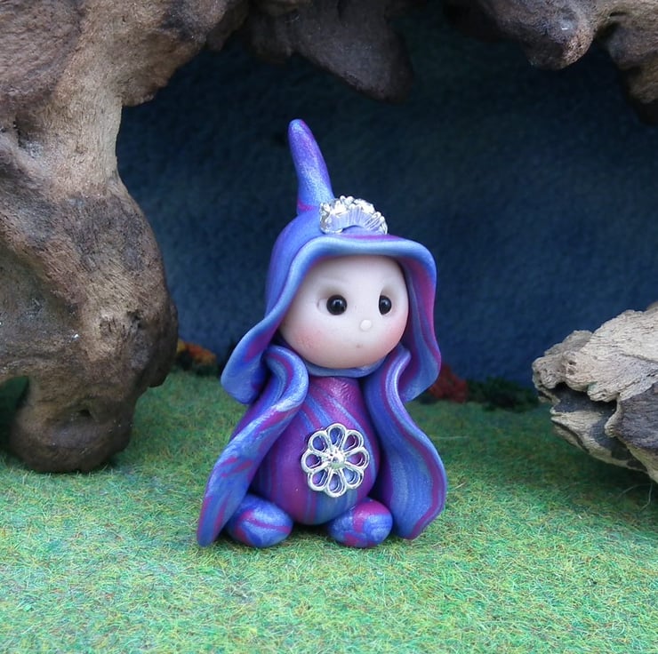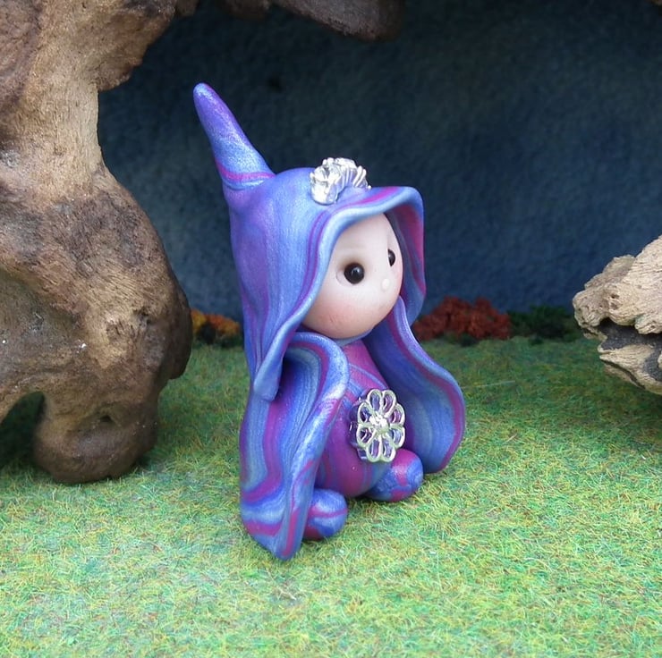 This is a 'one of a kind' creation having been entirely handmade without the use of moulds here at my studio on the Sussex Coast. Modelled with Prosculpt polymers, painted with heat set paints before sealing with lacquer, Orlah has sparkling black onyx eyes and variegated robes. Orlah the Gnome Maiden is just one and a half inches tall.