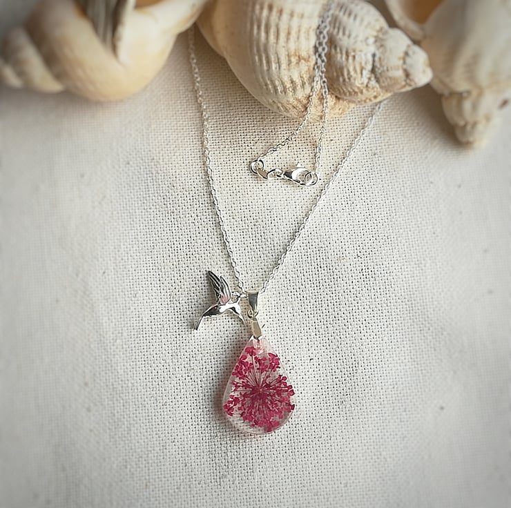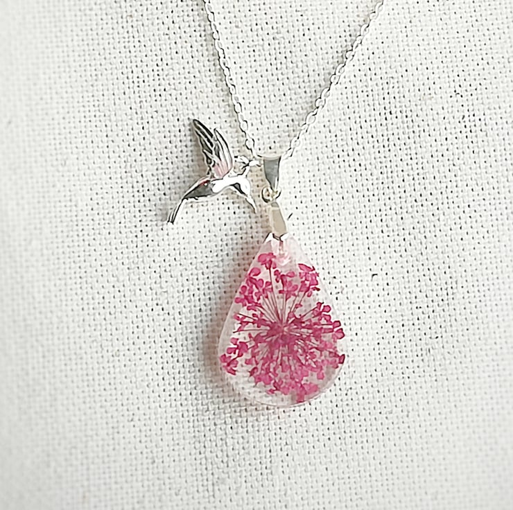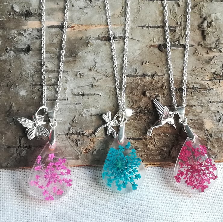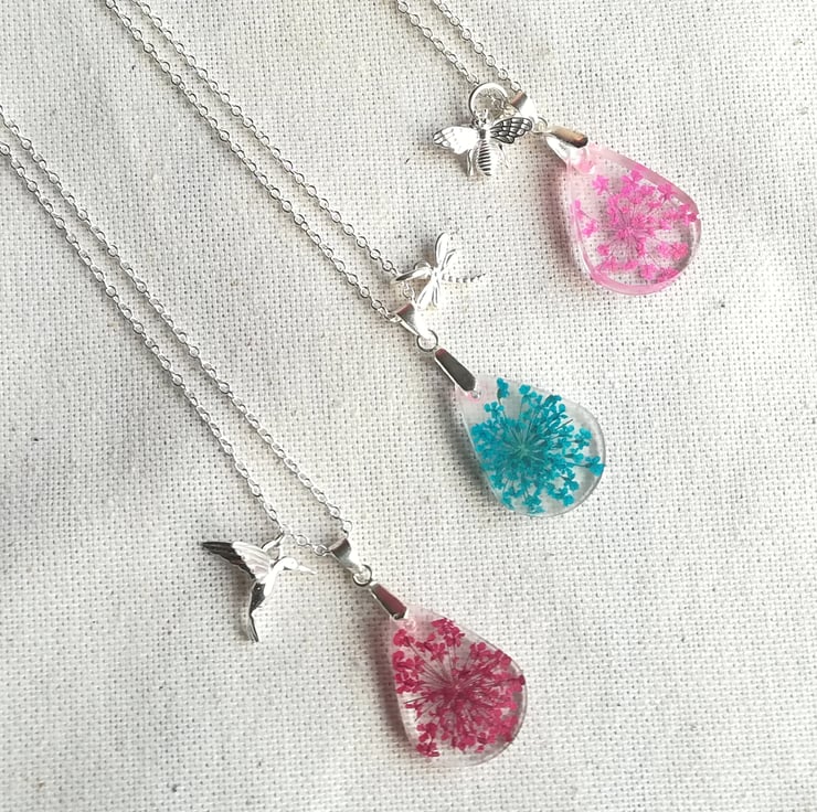 A cluster of delicate tiny flowers set in a tear drop resin pendant with a solid silver charm. You can personalise this necklace by choosing which charm you would like - bumble bee, humming bird or dragon fly. The flowers, set in crystal clear jewellery grade resin, and little silver charm are hung from a sterling silver bail on a 20 inch sterling silver chain. A perfect Birthday gift, gift for Mum, or addition to your spring/summer jewellery.