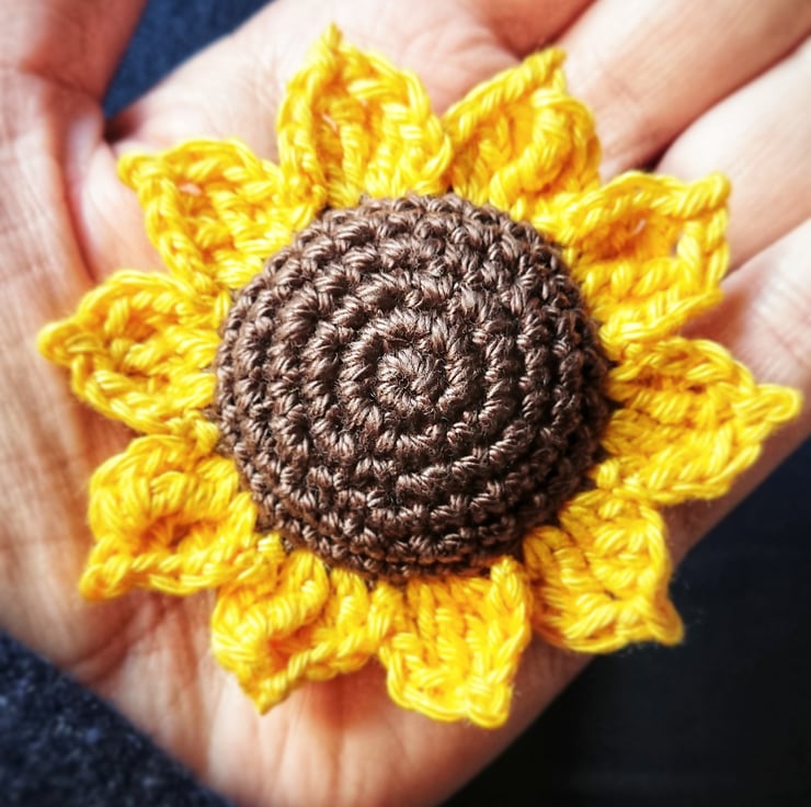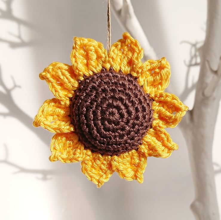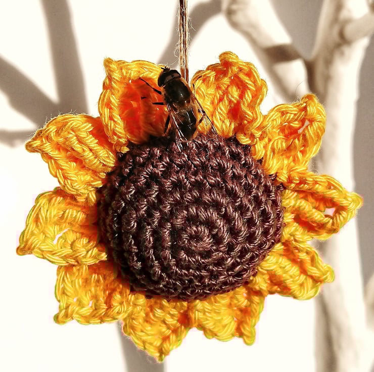 Crochet Sunflower Hanging Decoration with twine hanging loop.