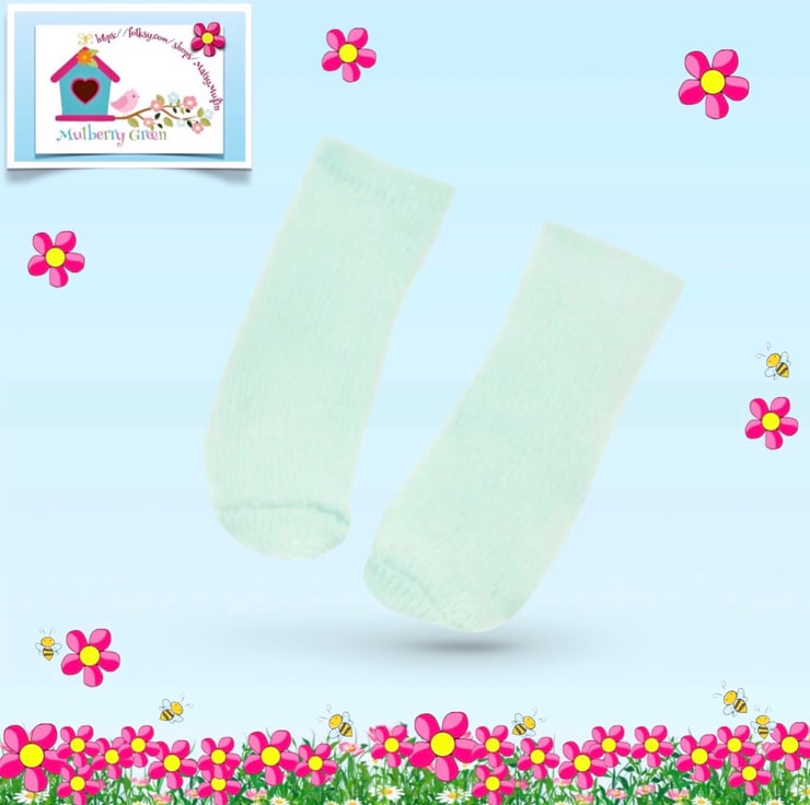 A cute little pair of turquoise ankle socks to fit the Mulberry Green characters. The socks look lovely with the little felt shoes.