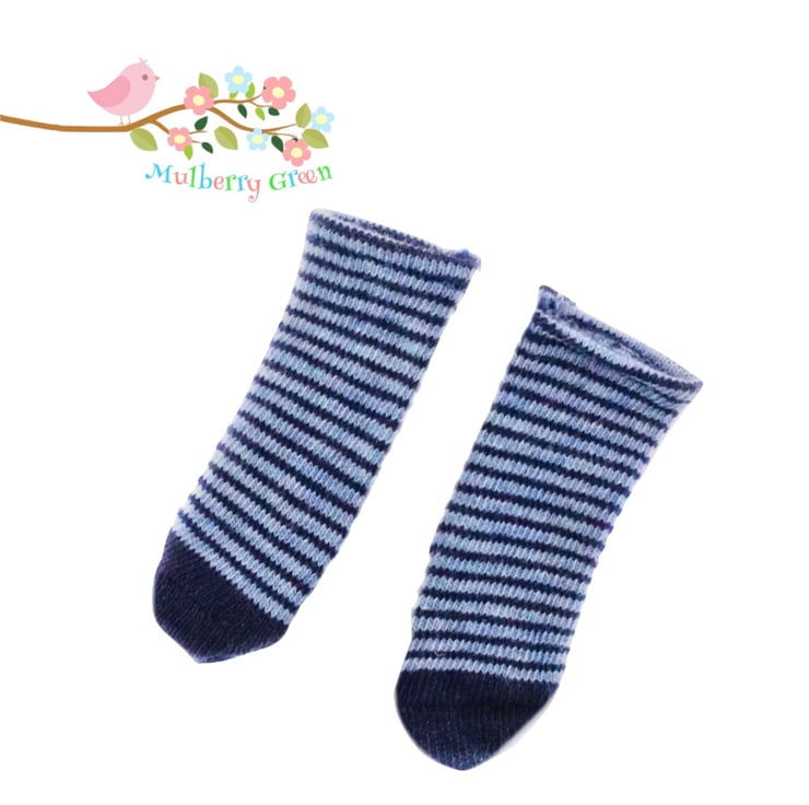 A cute little pair of blue and navy striped ankle socks to fit the Mulberry Green characters. The socks look lovely with the little felt shoes. They can also be put over the linen feet of the older version of my dolls so that shoes can be worn.