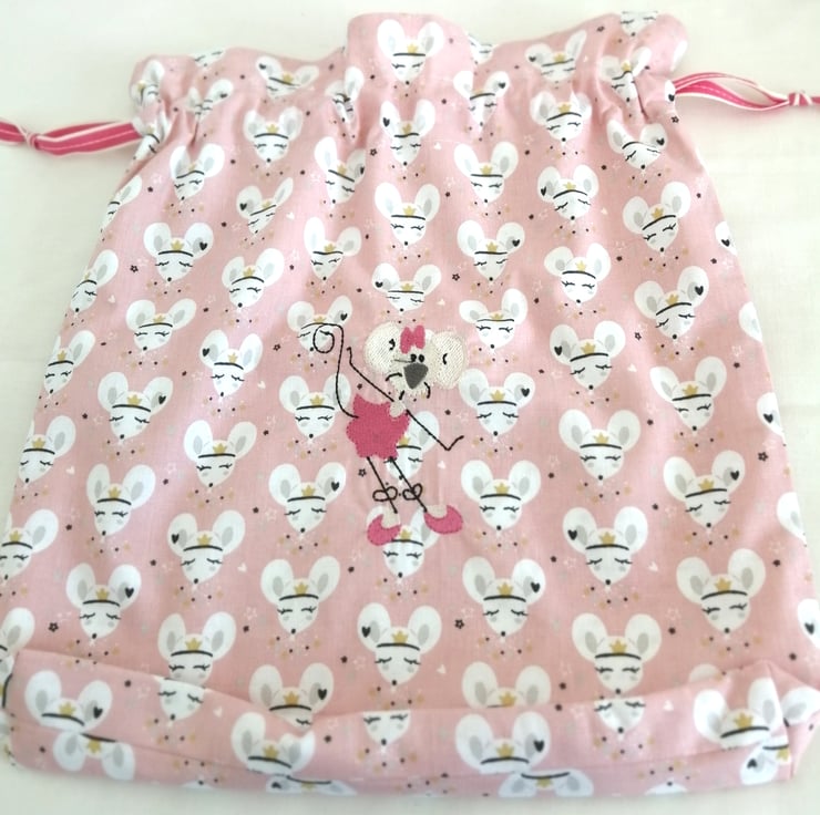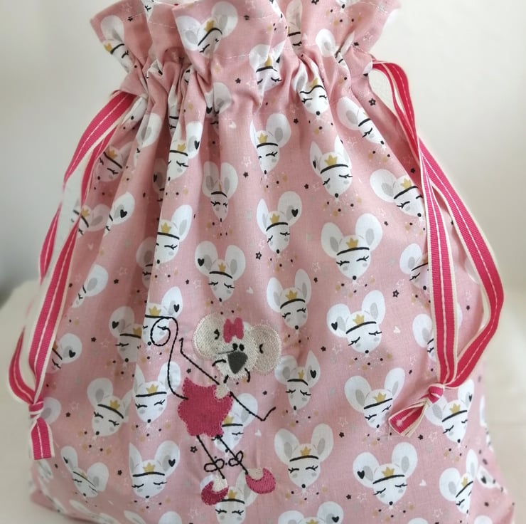 Cute drawstring bag made in a novelty mouse fabric. The bag is fully lined in a spotty fabric and has a dancing mouse embroidered on the front. The bag measures 12.5" x 13.5".