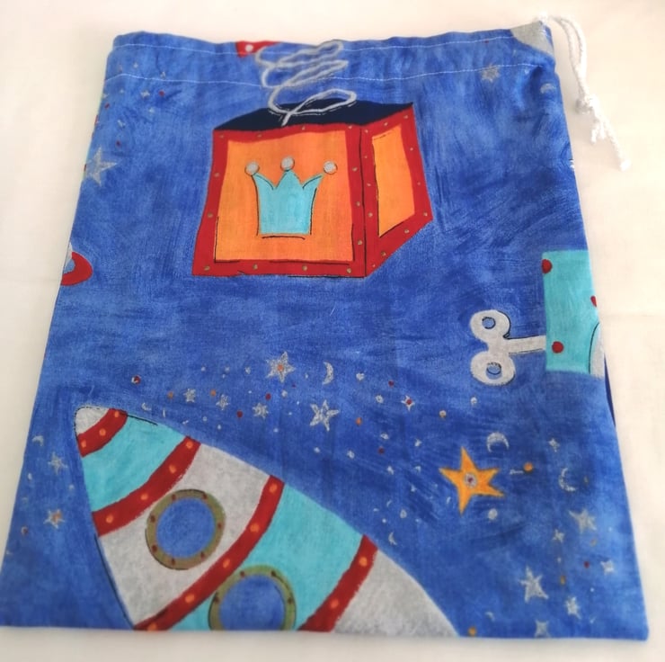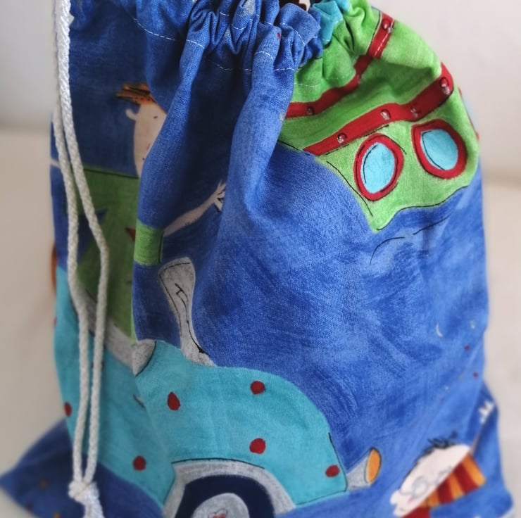 This drawstring bag is made in a lovely novelty fabric. The fabric features a boy, a car, a boat and a spaceship. The bag has a colourful lining. The bag measures 11.5" x 13".