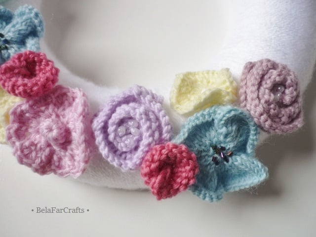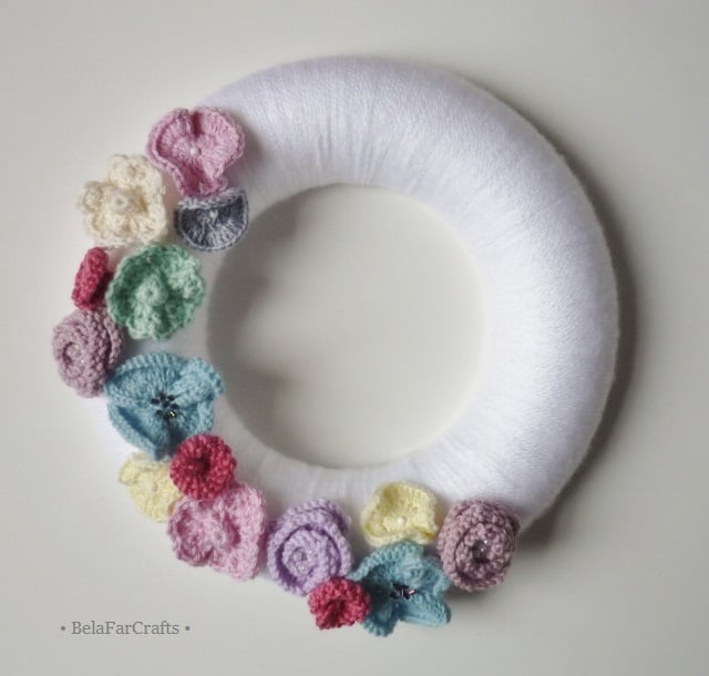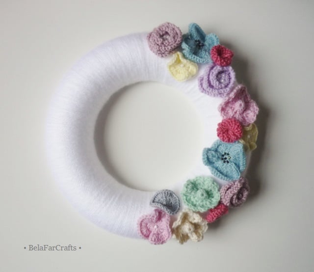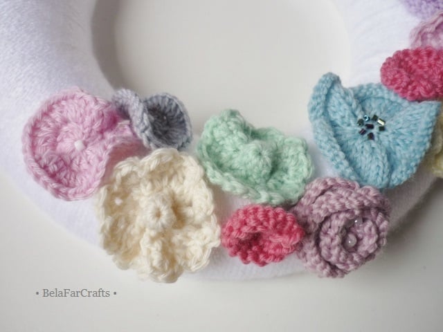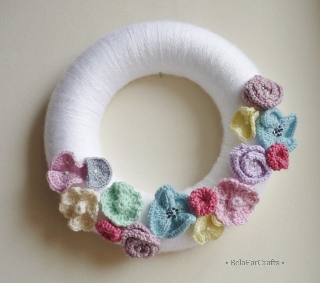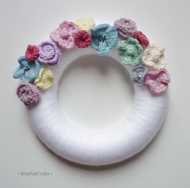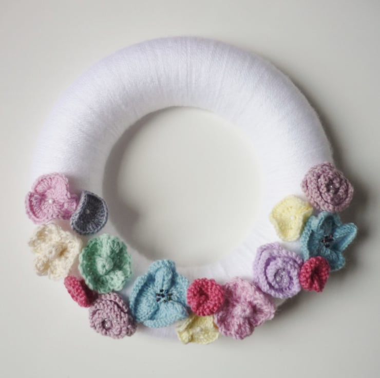 Hung on an indoor wall or sitting on a shelf this floral wreath will brighten up any space. I handmade 15 flowers in a few subtle and brighter colors, some decorated with beads. It is a stylish piece that will enhance adults' and kids' spaces all year round.
