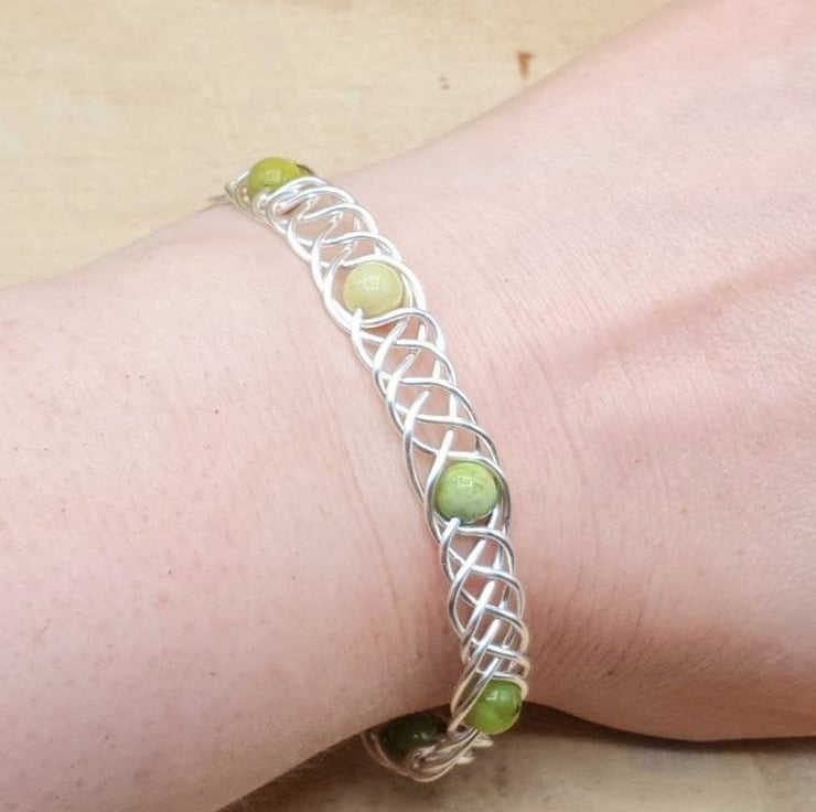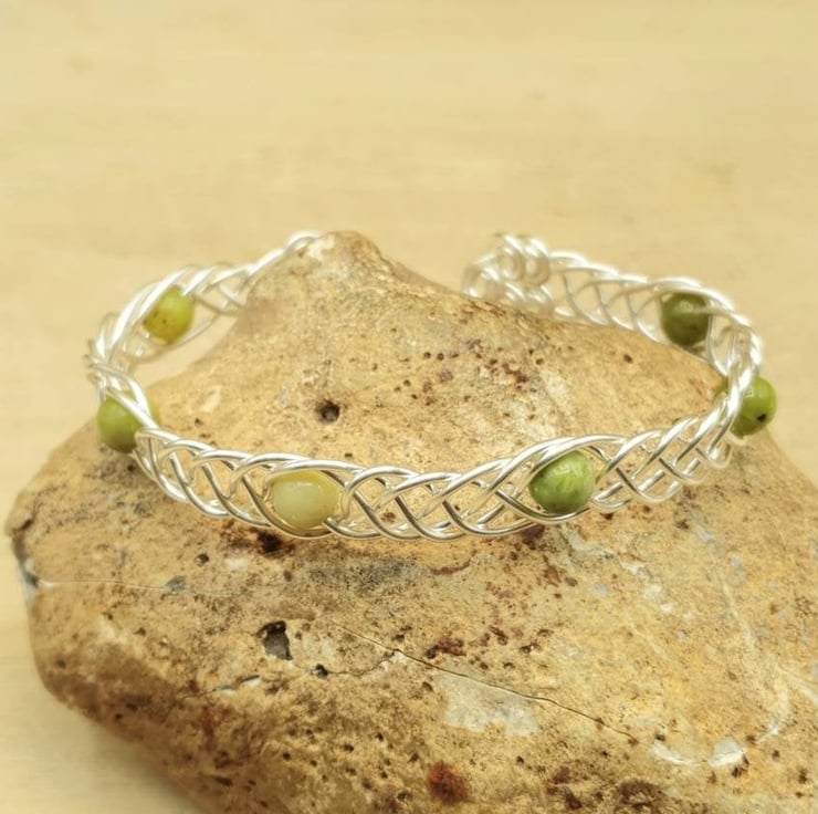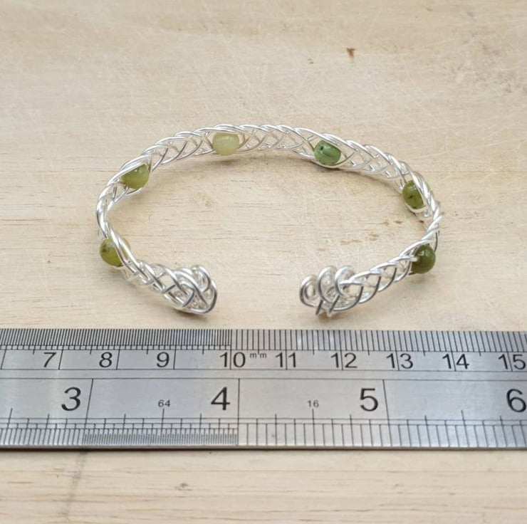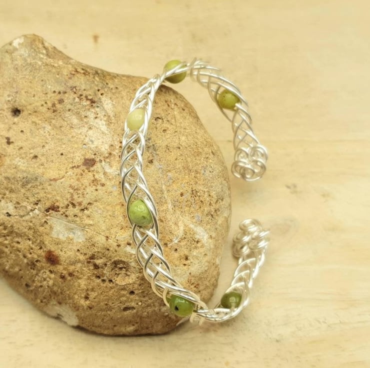 Adjustable Chrysoprase cuff bracelet. May Birthstone Wire wrapped Celtic Weave