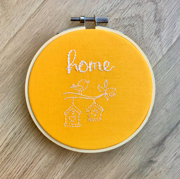 Hand embroidered hoop art featuring the word "Home", with a bird and house design underneath.