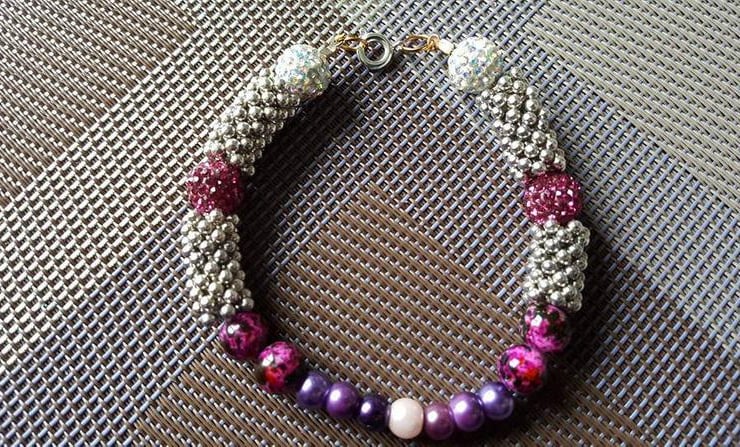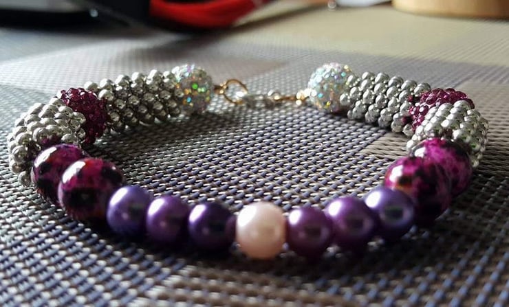 Made with multi coloured beads, snowflake spacer beads, 6mm glass pearls and 8mm mottled glass beads.