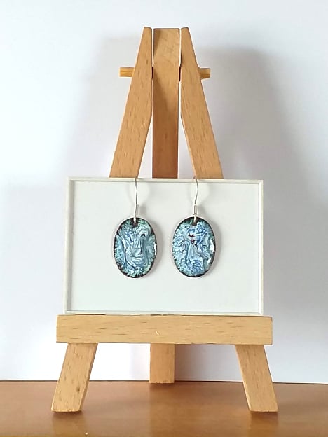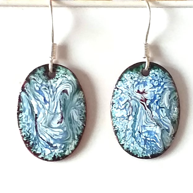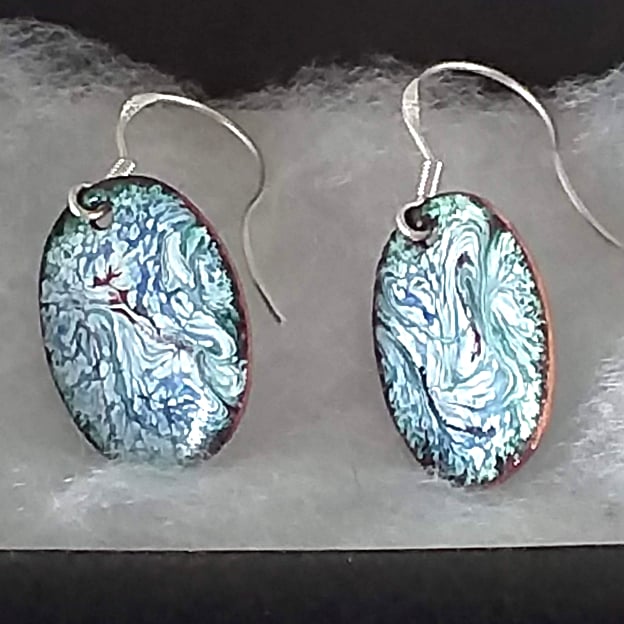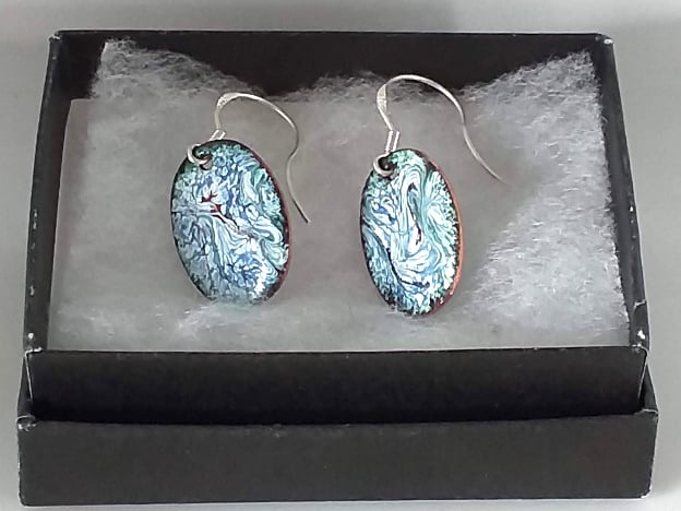 I made these earrings by building up several layers of white enamel over the copper shape, then scattering blue and red enamel over the white. When the ovals were red hot in the kiln I drew though the surface with a steel tip to draw out the rods of colour into a pattern. The patterns are random; they do not match on the two ovals. They do come close and they are unique.