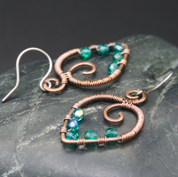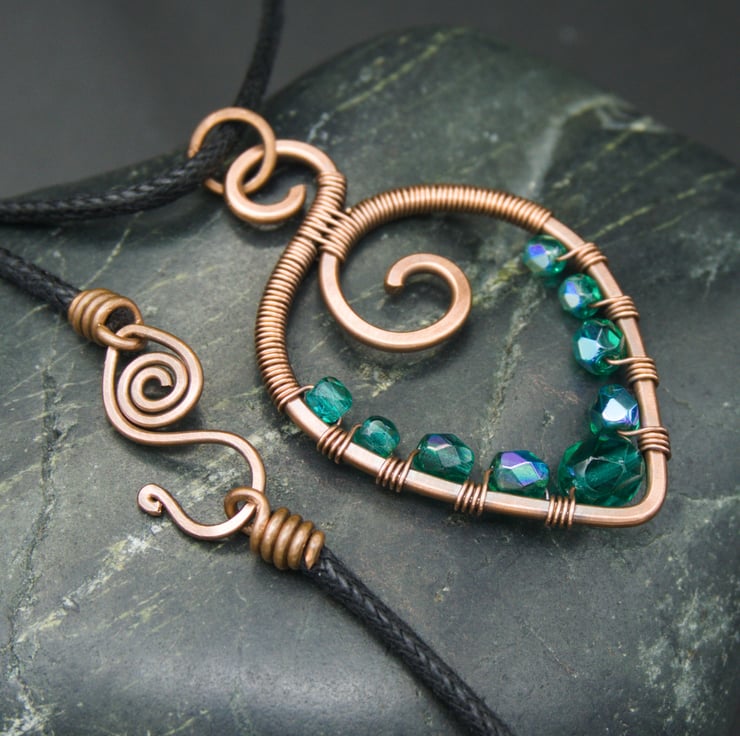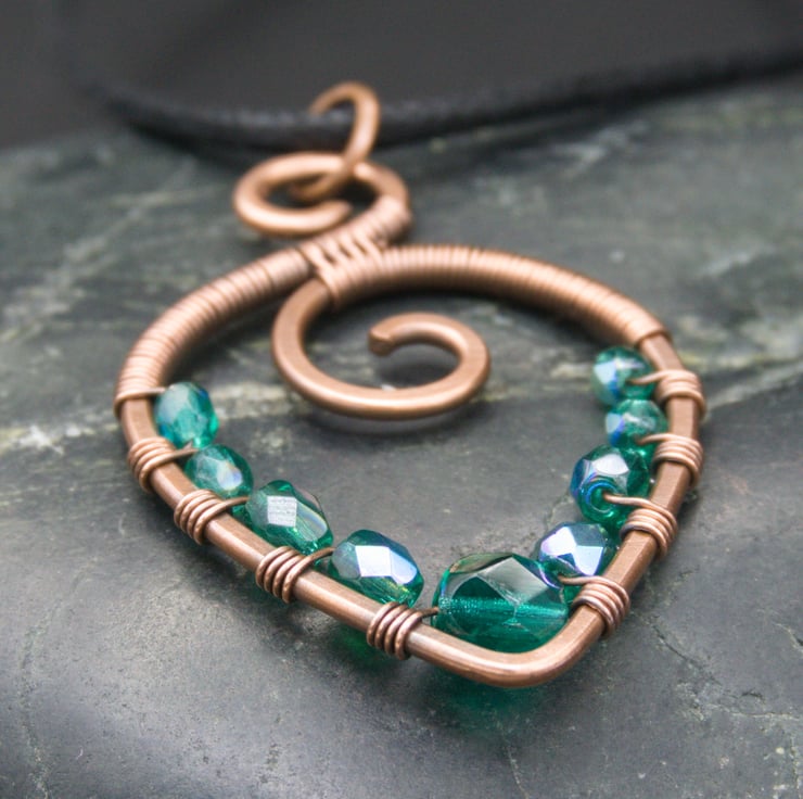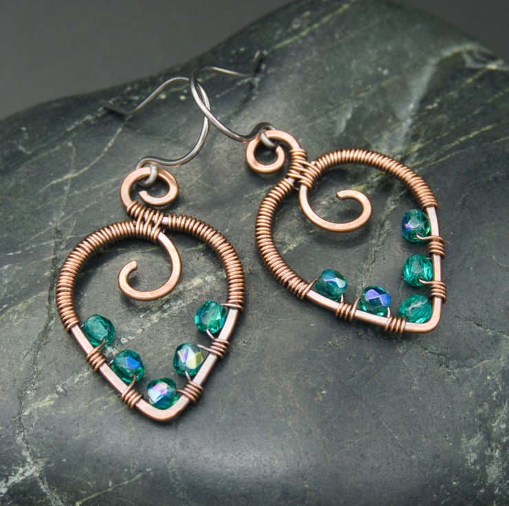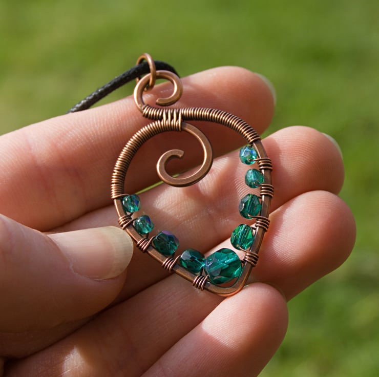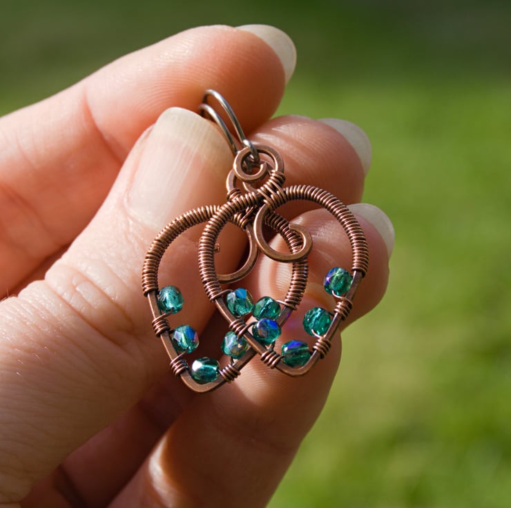 This pretty jewellery set consists of a hammered copper leaf shaped pendant with matching earrings. I've formed the pendant with thick wire, with a spiral inside the leaf & one above. I've then woven faceted glass beads inside the shape, with a larger one in the bottom middle then getting smaller towards the top - the beads are teal coloured & some have a part AB finish giving a glimmering effect for that extra bit of sparkle to the faceted glass. The matching shaped earrings are made from finer wire & have the same small beads woven into them.