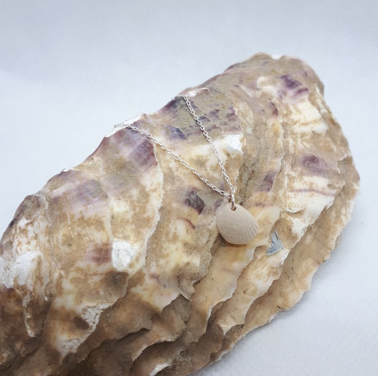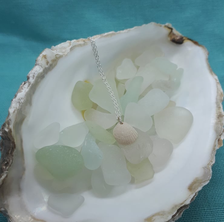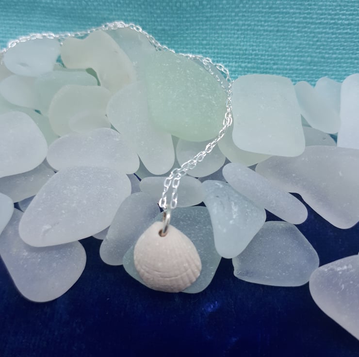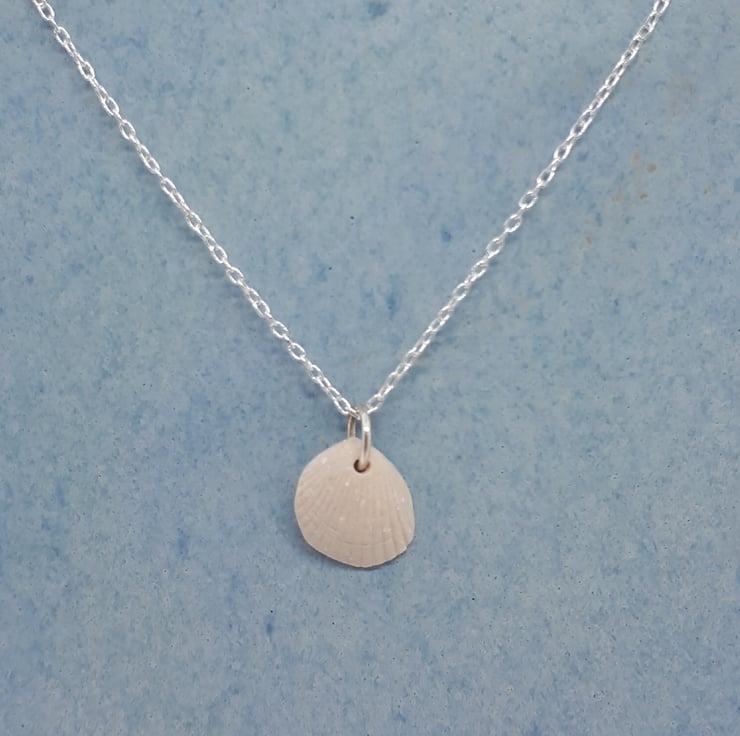 Handmade small ceramic cockle shell on a sterling silver trace chain.