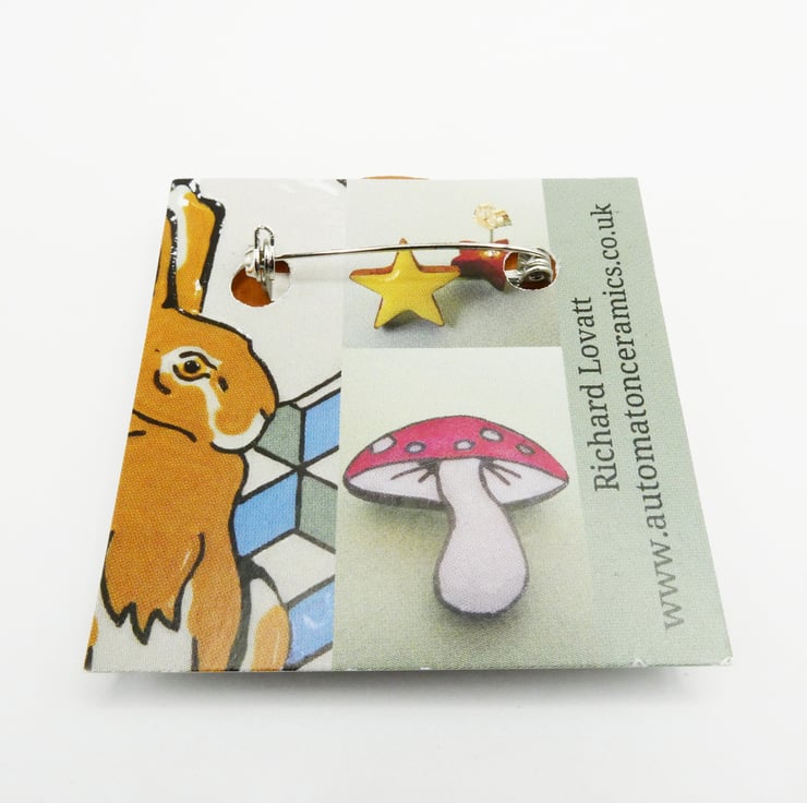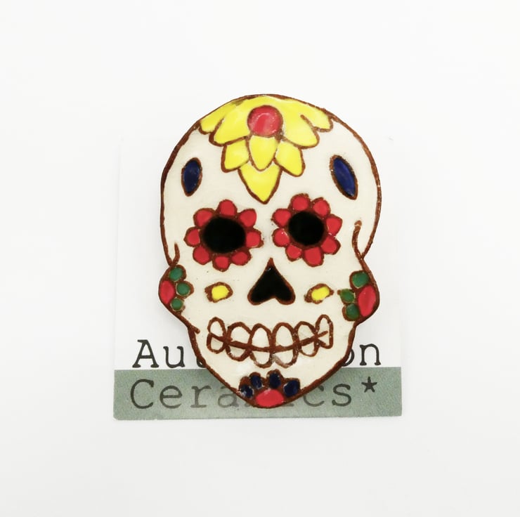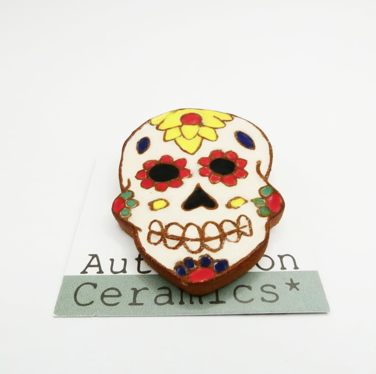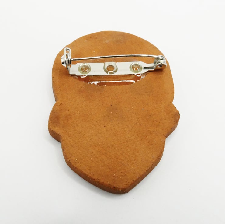 This brooch is handmade and designed by myself using a technique I have been developing. The clay is a dark chocolate terracotta with a white inlay that is then hand painted with under glaze. It has a clear glaze that make the colours more vibrant and rich.