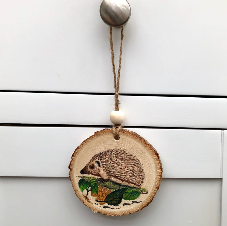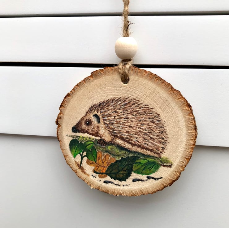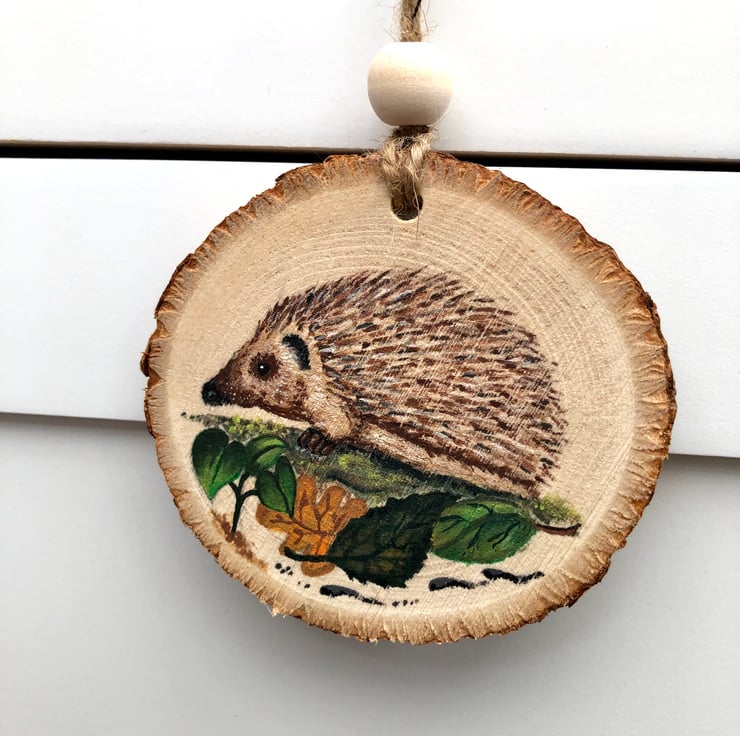 Natural wood slice with a hand painted portrait of a hedgehog sat amongst leaves.