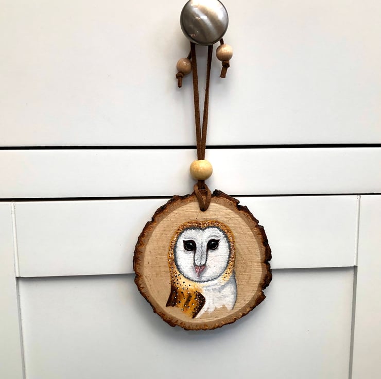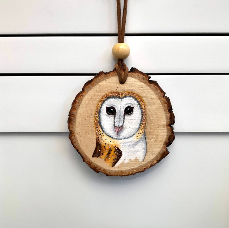 Natural wood slice with a hand painted portrait of a Barn owl.
