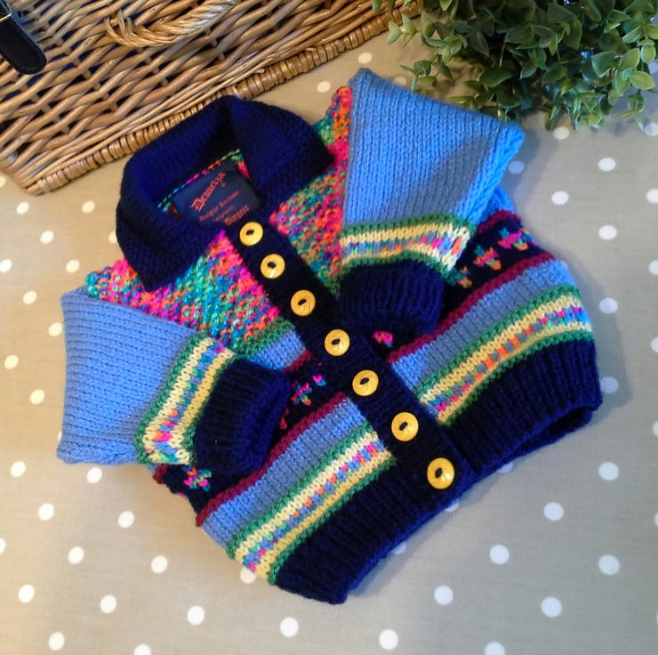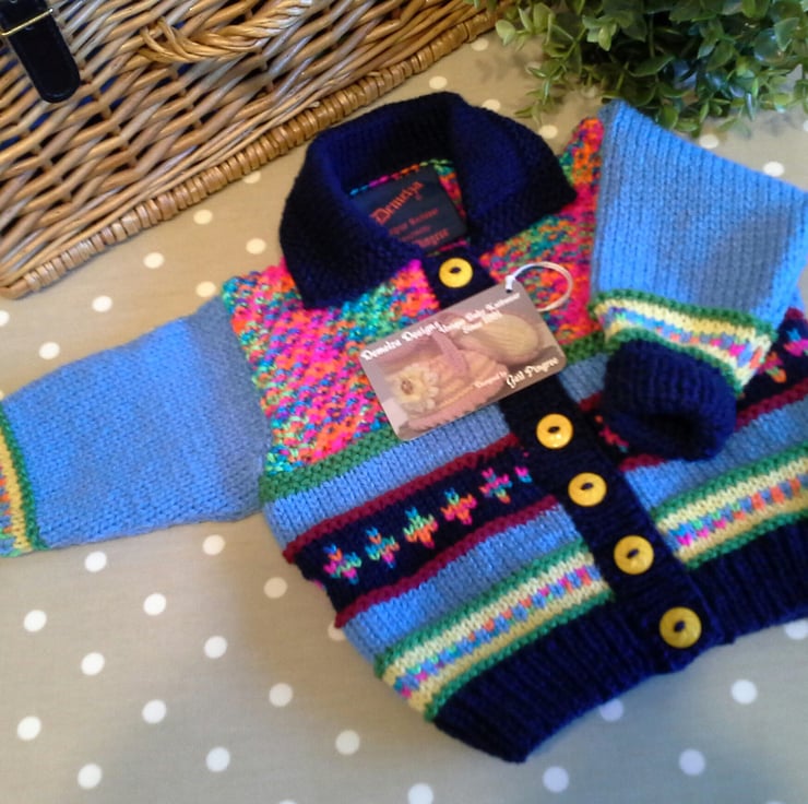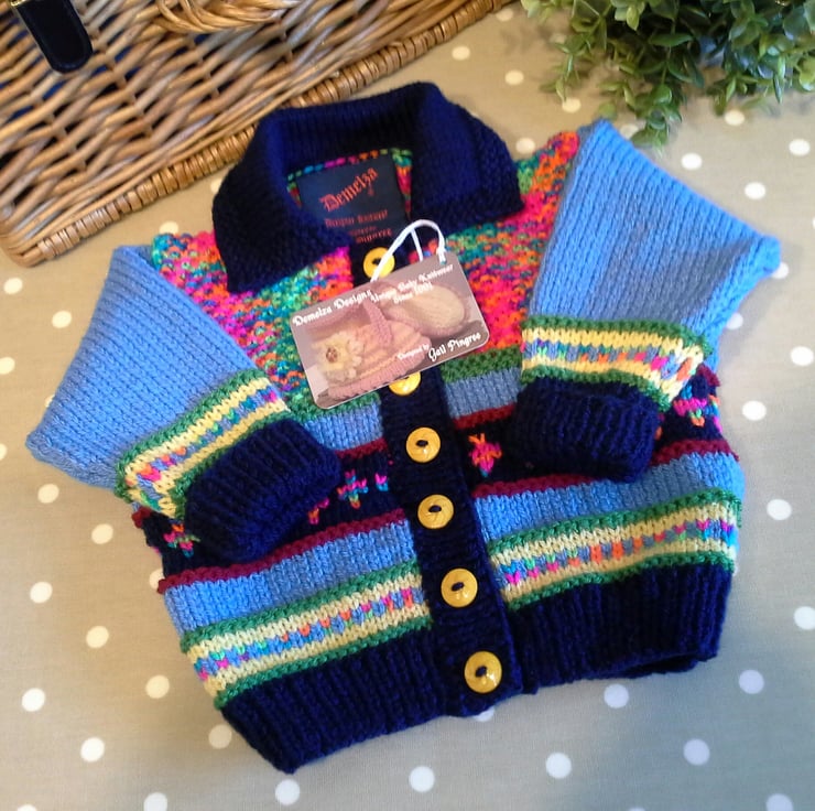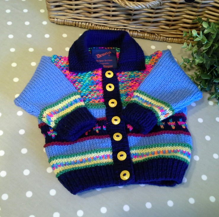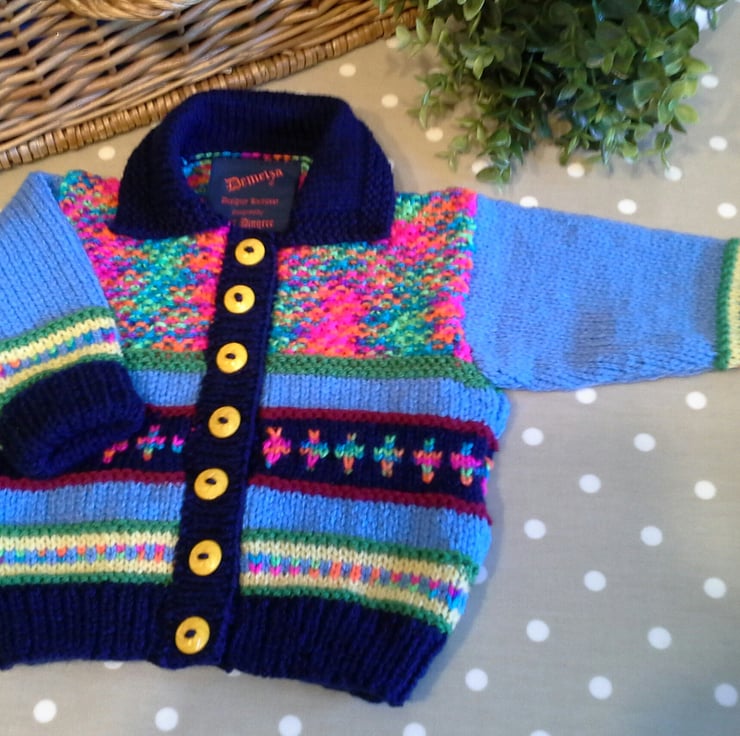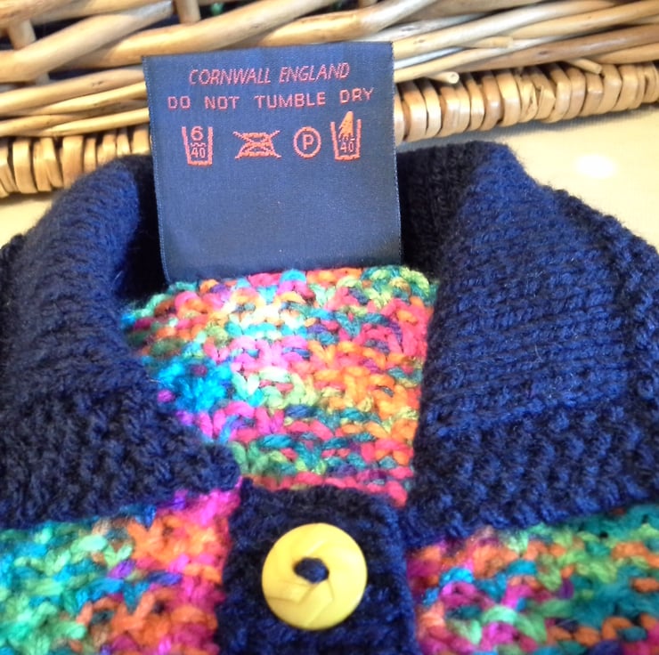 A sweet practical baby cardigan lovingly designed and hand crafted using quality branded premium acrylic yarns. All yarns used are machine washable at low temperatures. The yellow buttons have a textured design on them. The garment has the Demelza label attached to the back neck edge with the care instructions woven within it on the reverse side.