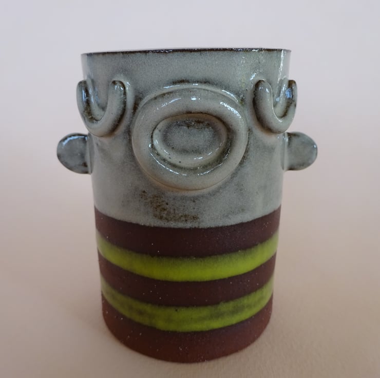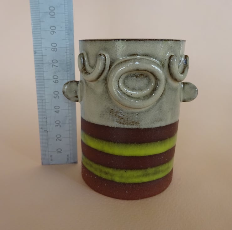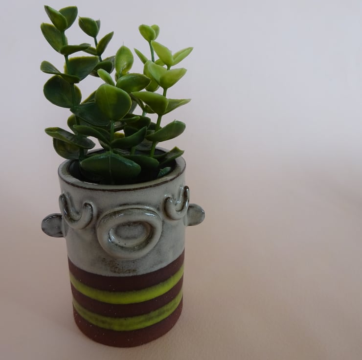 Comic face pot with closed eyes and open mouth like its just about to say something important. The pot is hand built from a dark Etruscan clay with a cream face and a stripy orange and red body .