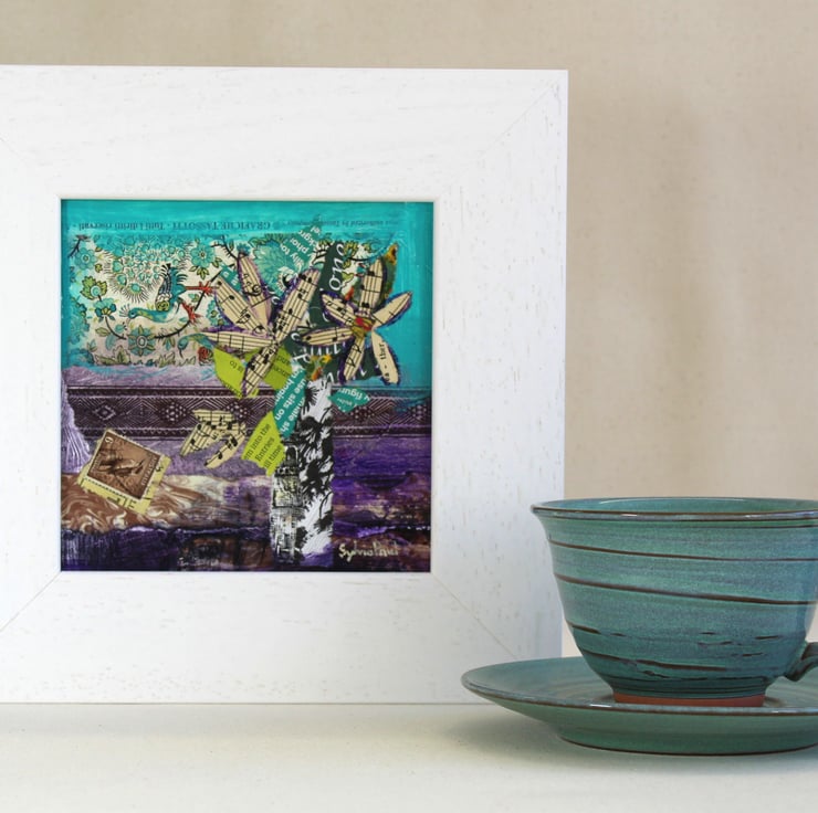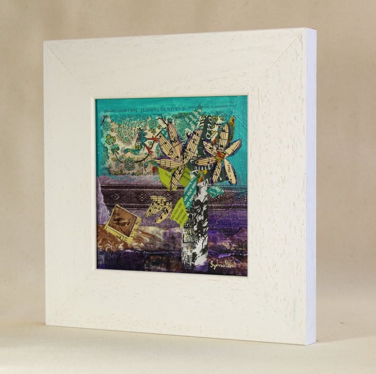A framed original acrylic and collage painting on board, Including the frame it measures 23 x 23 cms. The board size is 15 x 15 cms. I have used various papers and acrylic paint in layers to create this unique piece. Varnished with a UV filter varnish to protect from the light and dust. The painting would work well displayed on a shelf on it's own. or displayed with other small paintings. The photo of the group of four paintings is a virtual room and the frame is not the same as the real one shown in the other photos but it gives you an idea.