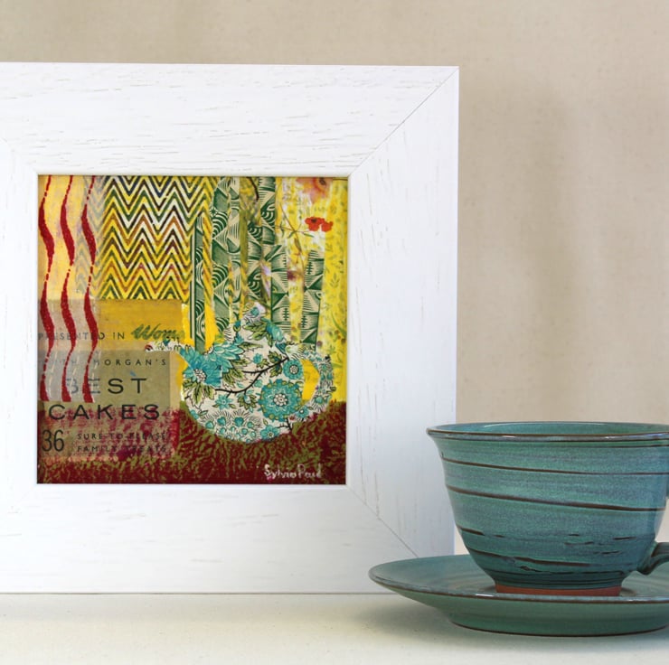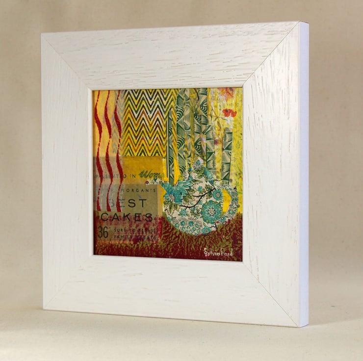 A framed original acrylic and collage painting on board, Including the frame it measures 23 x 23 cms. The board size is 15 x 15 cms. I have used various papers and acrylic paint in layers to create this unique piece. Varnished with a UV filter varnish to protect from the light and dust. The painting would work well displayed on a shelf on it's own. or displayed with other small paintings. The photo of the group of four paintings is a virtual room and the frame is not the same as the real one shown in the other photos but it gives you an idea.