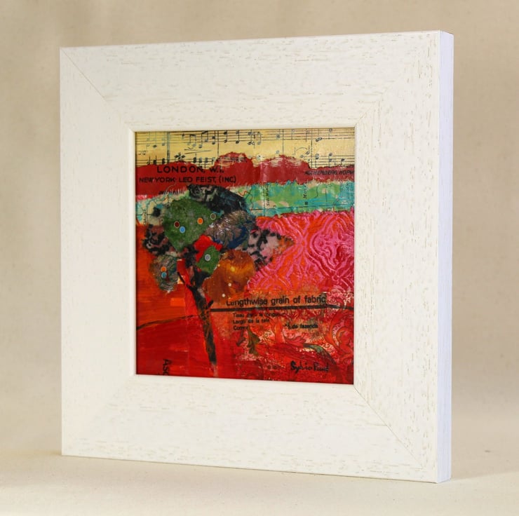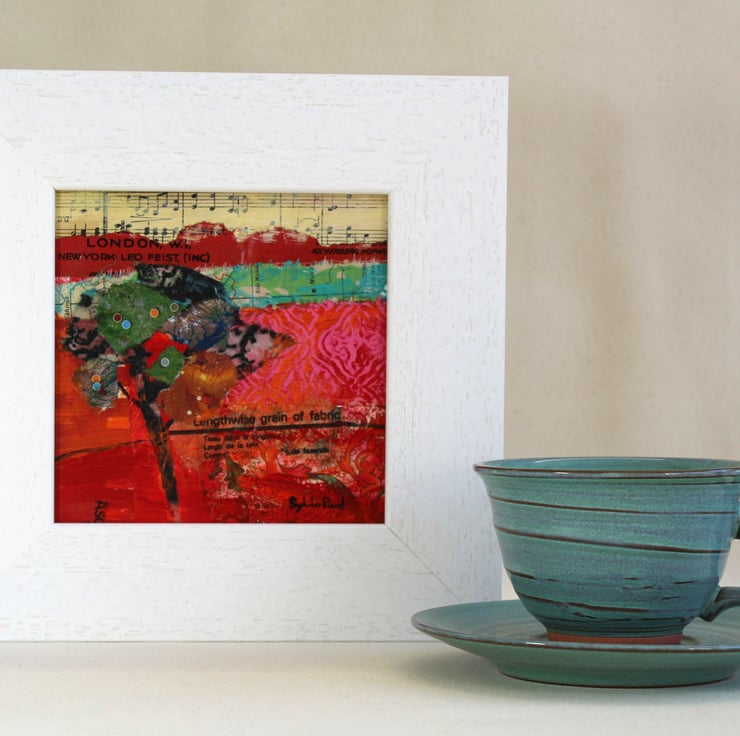 A framed original acrylic and collage painting on board, Including the frame it measures 23 x 23 cms. The board size is 15 x 15 cms. I have used various papers and acrylic paint in layers to create this unique piece. Varnished with a UV filter varnish to protect from the light and dust. The painting would work well displayed on a shelf on it's own. or displayed with other small paintings. The photo of the group of four paintings is a virtual room and the frame is not the same as the real one shown in the other photos but it gives you an idea.