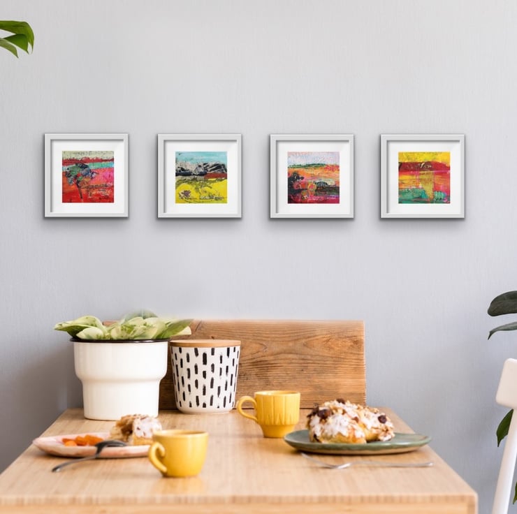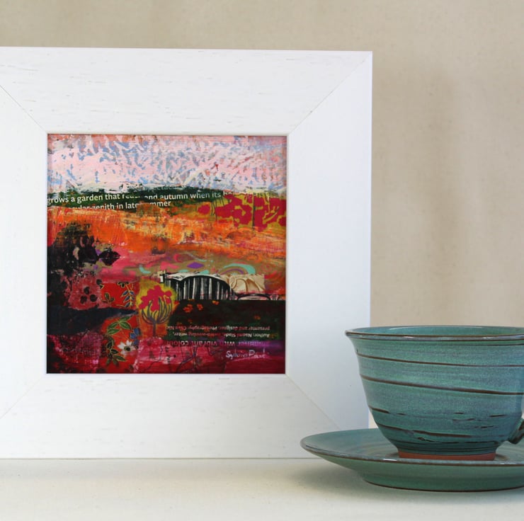 A framed original acrylic and collage painting on board, Including the frame it measures 23 x 23 cms. The board size is 15 x 15 cms. I have used various papers and acrylic paint in layers to create this unique piece. Varnished with a UV filter varnish to protect from the light and dust. The painting would work well displayed on a shelf on it's own. or displayed with other small paintings. The photo of the group of four paintings is a virtual room and the frame is not the same as the real one shown in the other photos but it gives you an idea.
