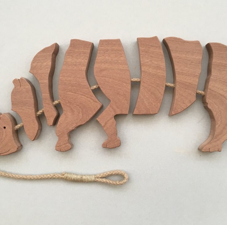 Rhinoceros Trivet, designed and handmade by me from Sapele (dark coloured hardwood of the Mahogany family) or Tulipwood (light coloured hardwood of the Poplar Family), Jute Cord and Flax Twine.