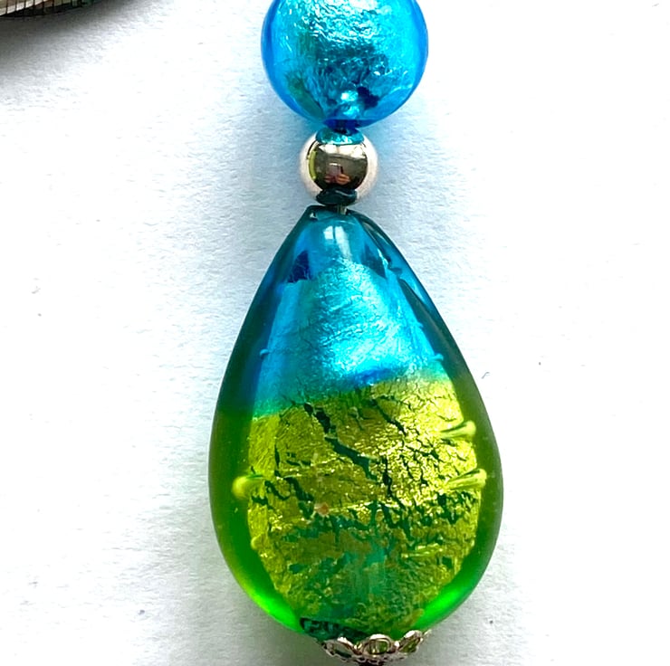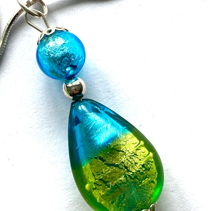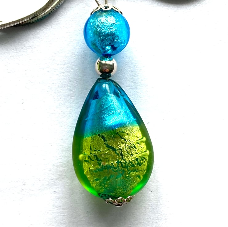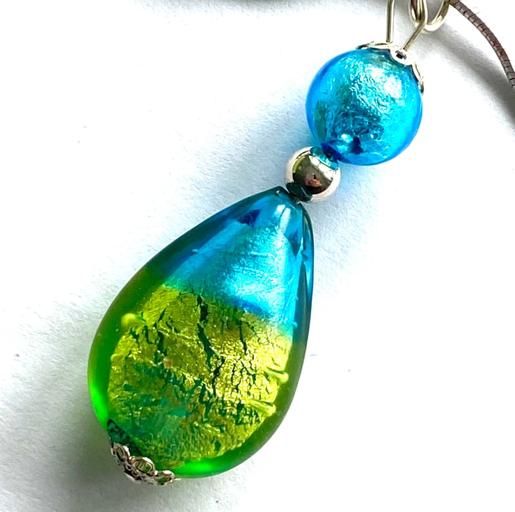 A gorgeous Murano glass pendant with a lime and dark aqua 24k gold foiled small pear drop bead (15 x 20mm) and a pure silver foiled turquoise Murano glass round bead and a sterling silver round bead. The pendant measures 35mm in height and hangs from a sterling silver chain (18ins) and is presented in a pretty gift pouch.