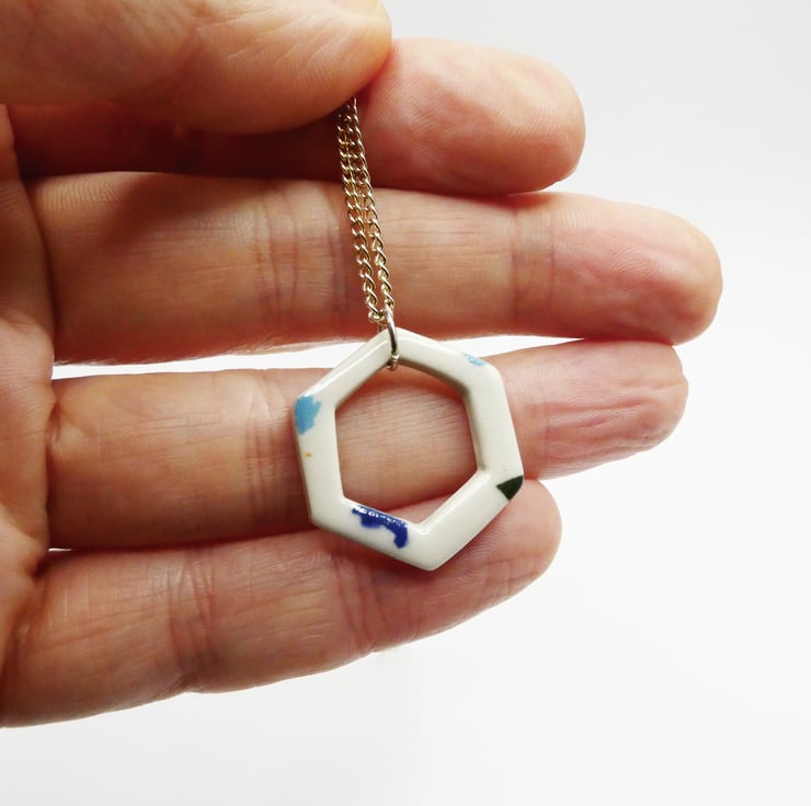Medium hexagon pendant necklace with terrazzo style pattern. The pendant is made from a porcelain white clay with multi coloured slips and finished with a clear glaze. The pendant comes on a silver plated chain.