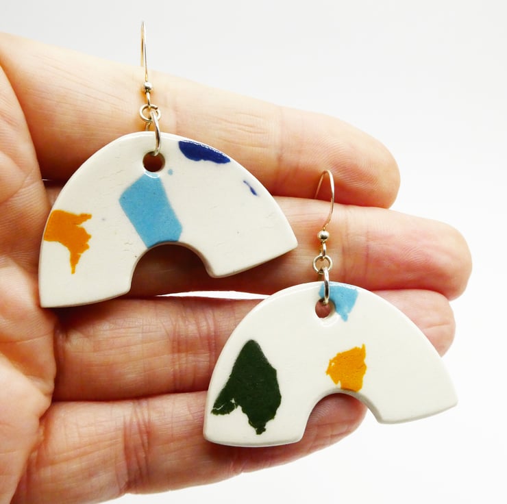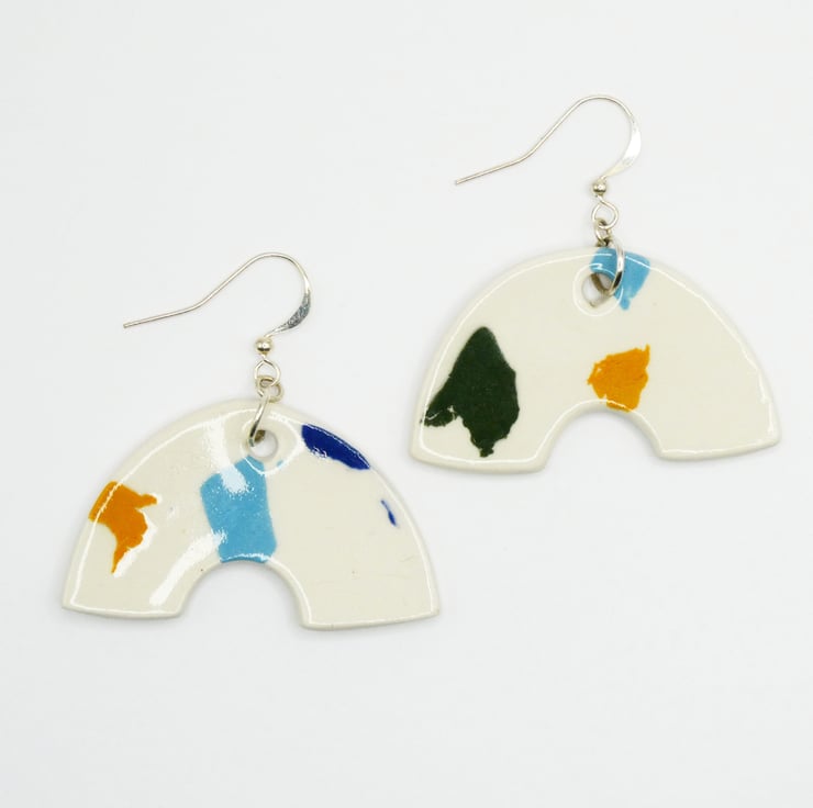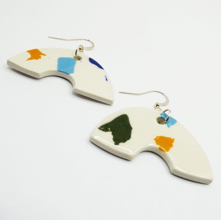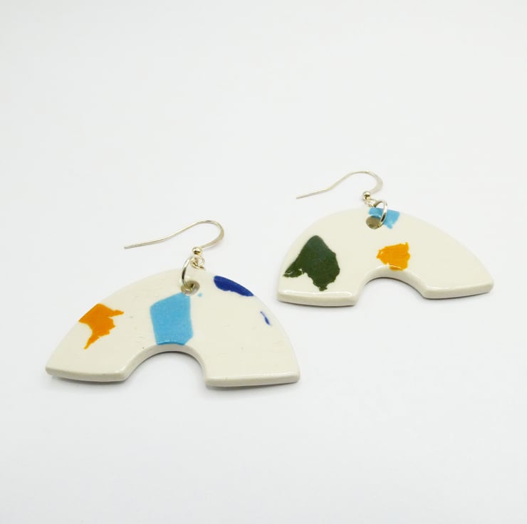 Large arch shaped statement jewellery. These earrings are made from a white ceramic clay with inlaid bright colours in a terrazzo style. They are finished with a clear glaze.