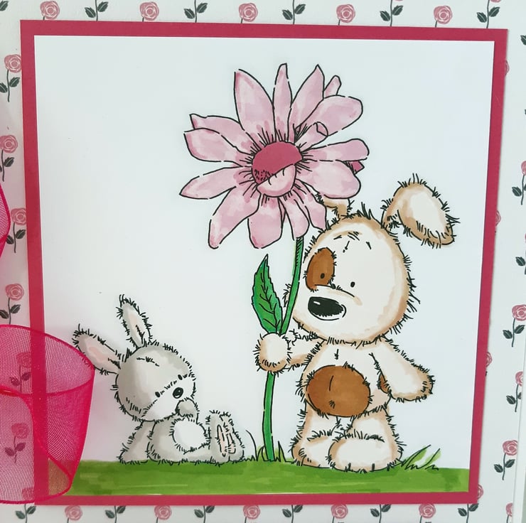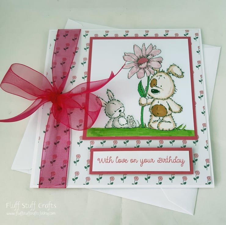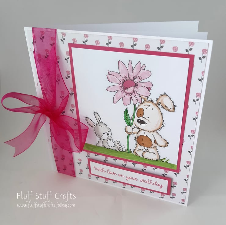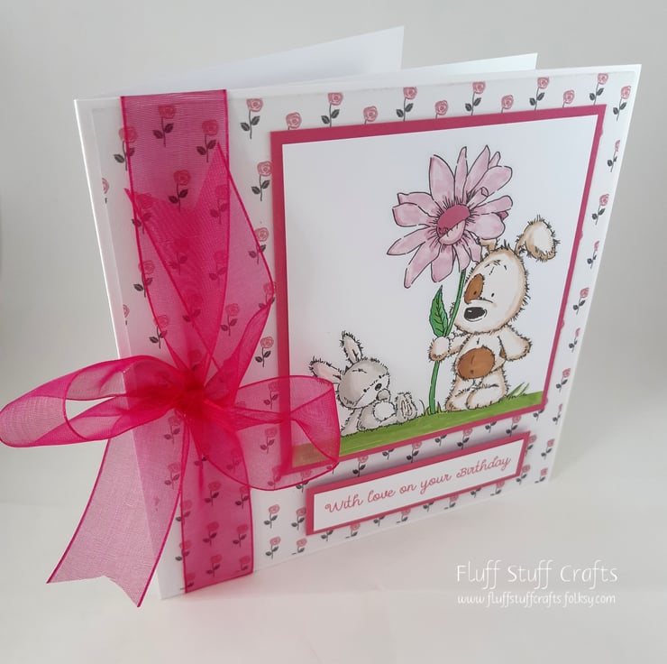 Square birthday card featuring a hand coloured image of a cute bunny and a dog holding a large pink daisy. The image and sentiment 'With love on your Birthday' have both been framed in bright pink card and overlaid onto a background of pink roses. The card has been embellished with a large, bright pink, organza ribbon bow.