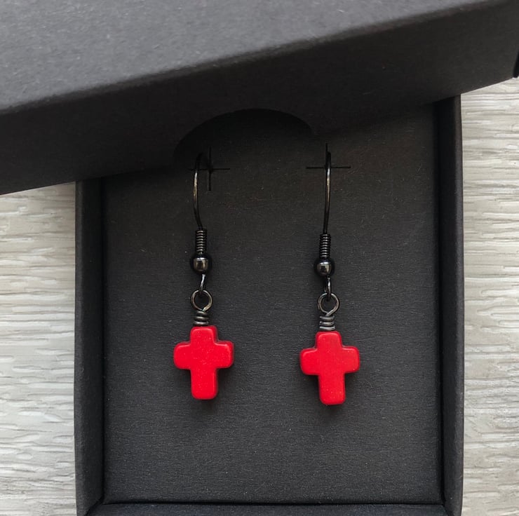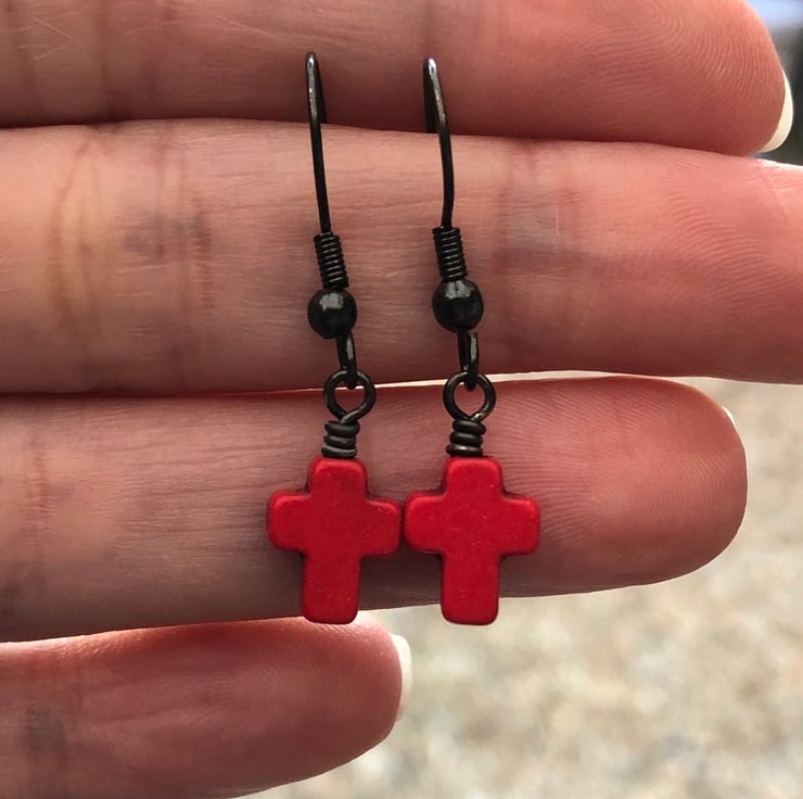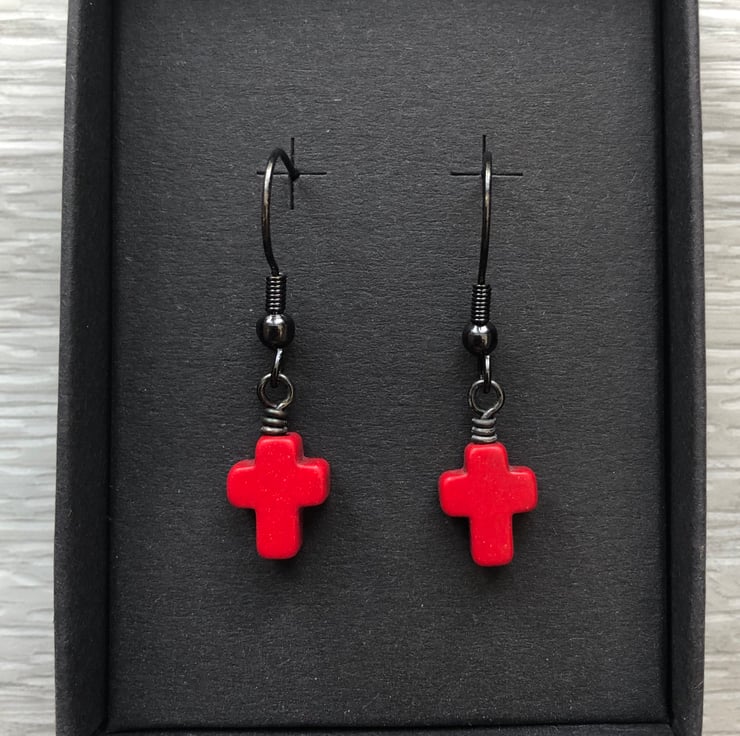 Made using 10x8mm dyed howlite cross beads, simply hand wired onto a antique black brass headpins and hangs from matching fish hook earrings.