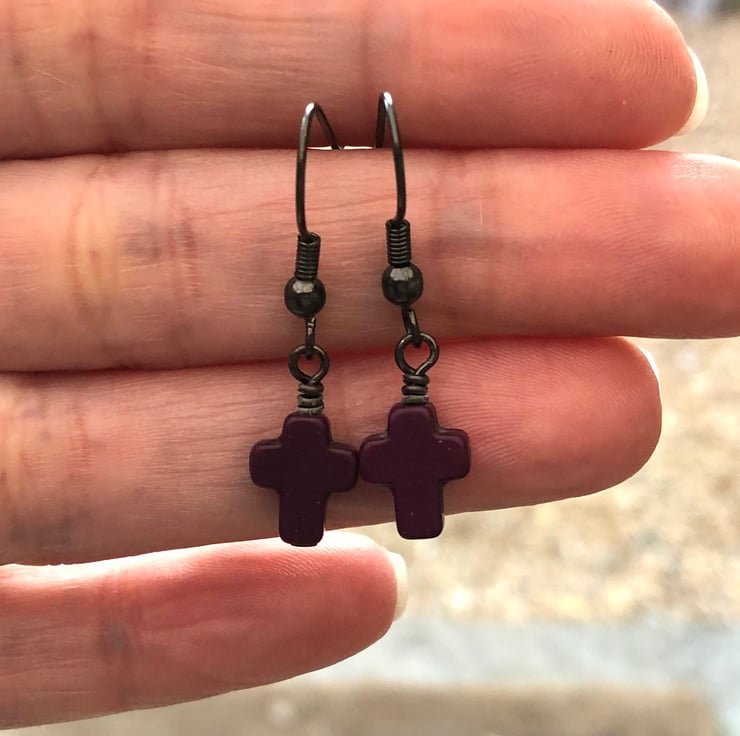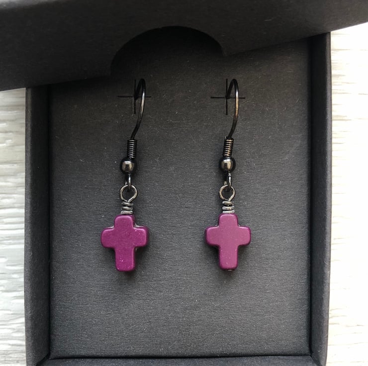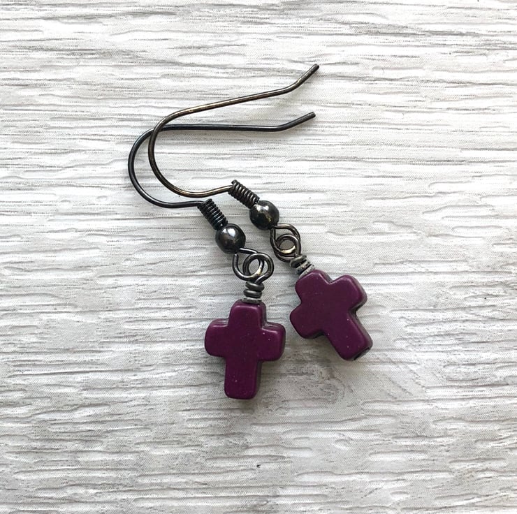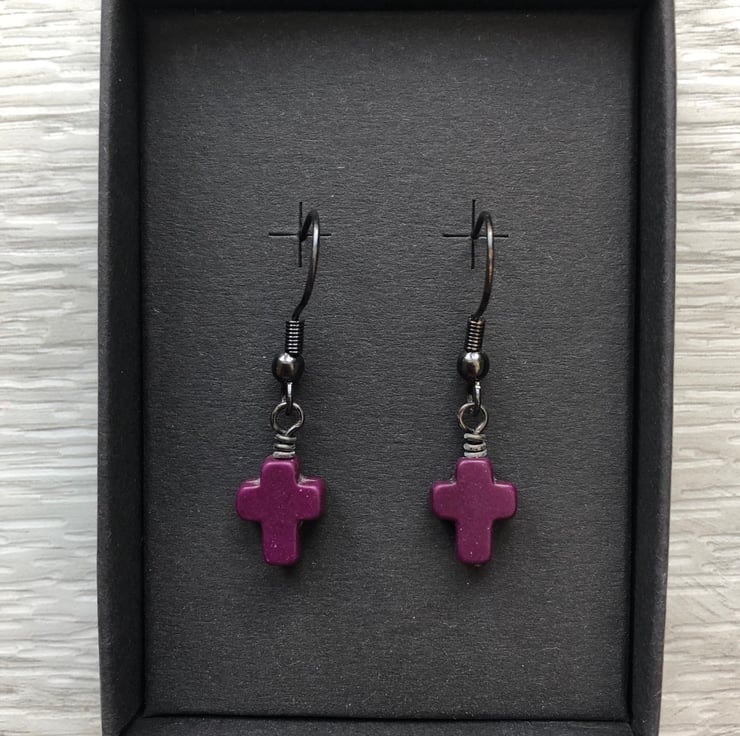 Made using 10x8mm dyed howlite cross beads, simply hand wired onto a antique black brass headpins and hangs from matching fish hook earrings.