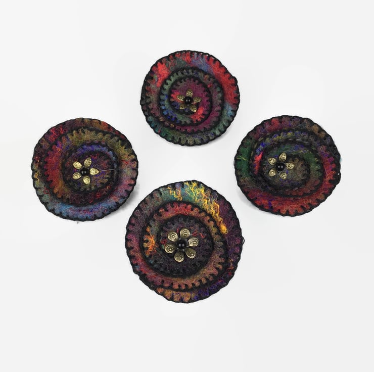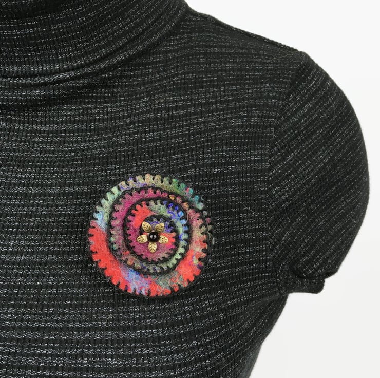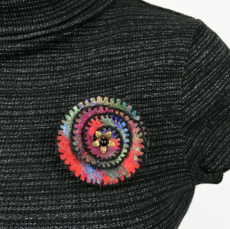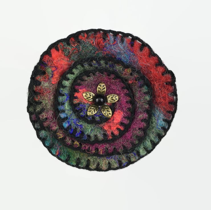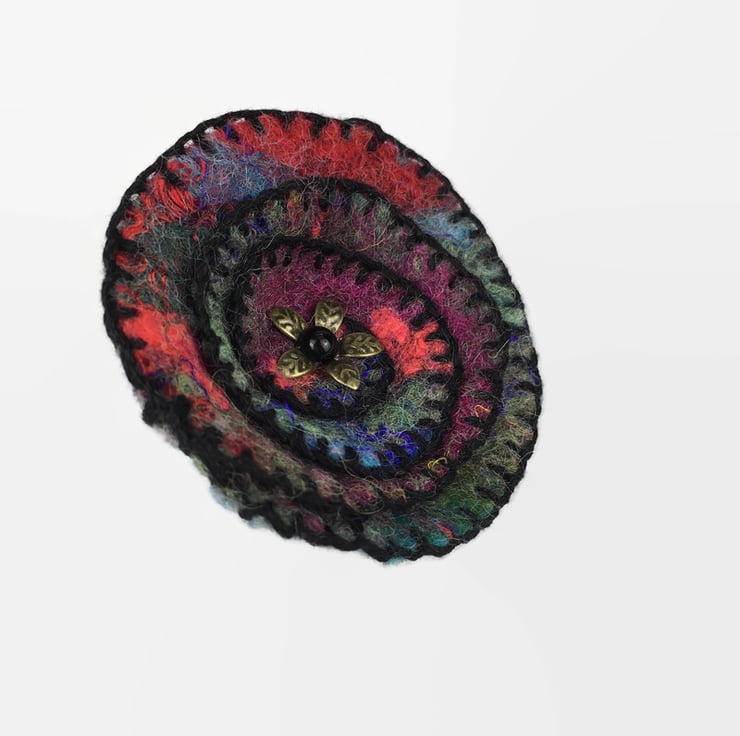 This felt brooch has been made using a piece of multicoloured hand made felt. Included in Seconds Sunday as an end of line item. The felt has been cut and stitched into a spiral, slightly conical shape. The edges have been hand stitched in a blanket stitch using black embroidery thread. At the centre of the spiral an "antique bronze" effect flower with a black beaded centre has been added. The reverse of the brooch is covered with grey commercial felt and a silver tone brooch pin added.