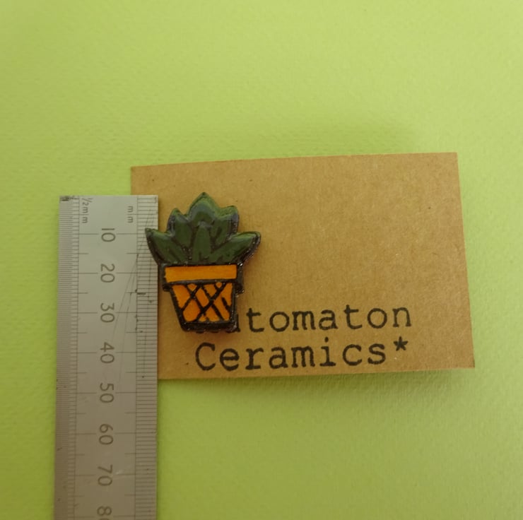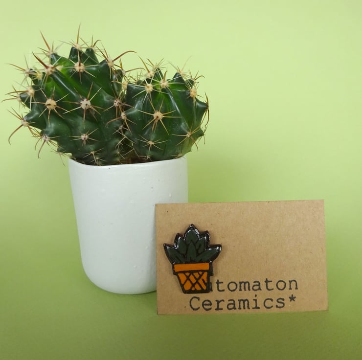 Small cactus pin badge in pot made from an Etruscan red clay with coloured slips. The clay is rolled and printed and then coloured slips are added, it has a clear glaze to make the colours more vibrant. It has a safety brooch pin securely glued to the back.